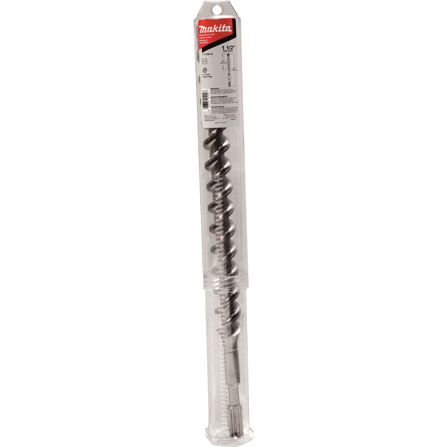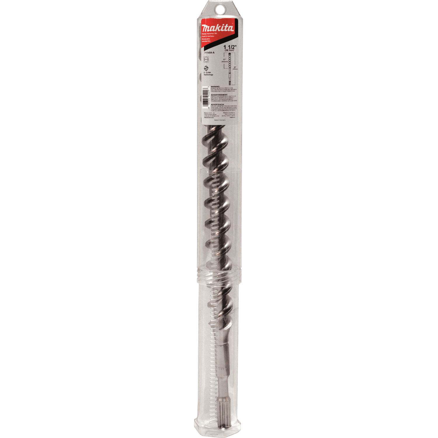 Makita 4-Cutter Spline Bit is designed to work with Rotary Hammers that accept Spline shank bits to drill holes in concrete. The 4-cutter technology combines with the central guiding action for efficientand accurate drilling. The high quality steel and special impact grade carbide make for added durability and long life. 4-cutter technology for reduced friction and rapid dust removal. Central guiding action for accurate holes. Centering tip features a more aggressive design for faster hole starting. Engineered for reduced vibration. Wear marking on primary cutter indicates bit wear. Made of the highest quality chrome-nickel-molybdenum steel. For drilling holes in concrete; 17" usable length. For use with Rotary Hammers that accept Spline shank bits.