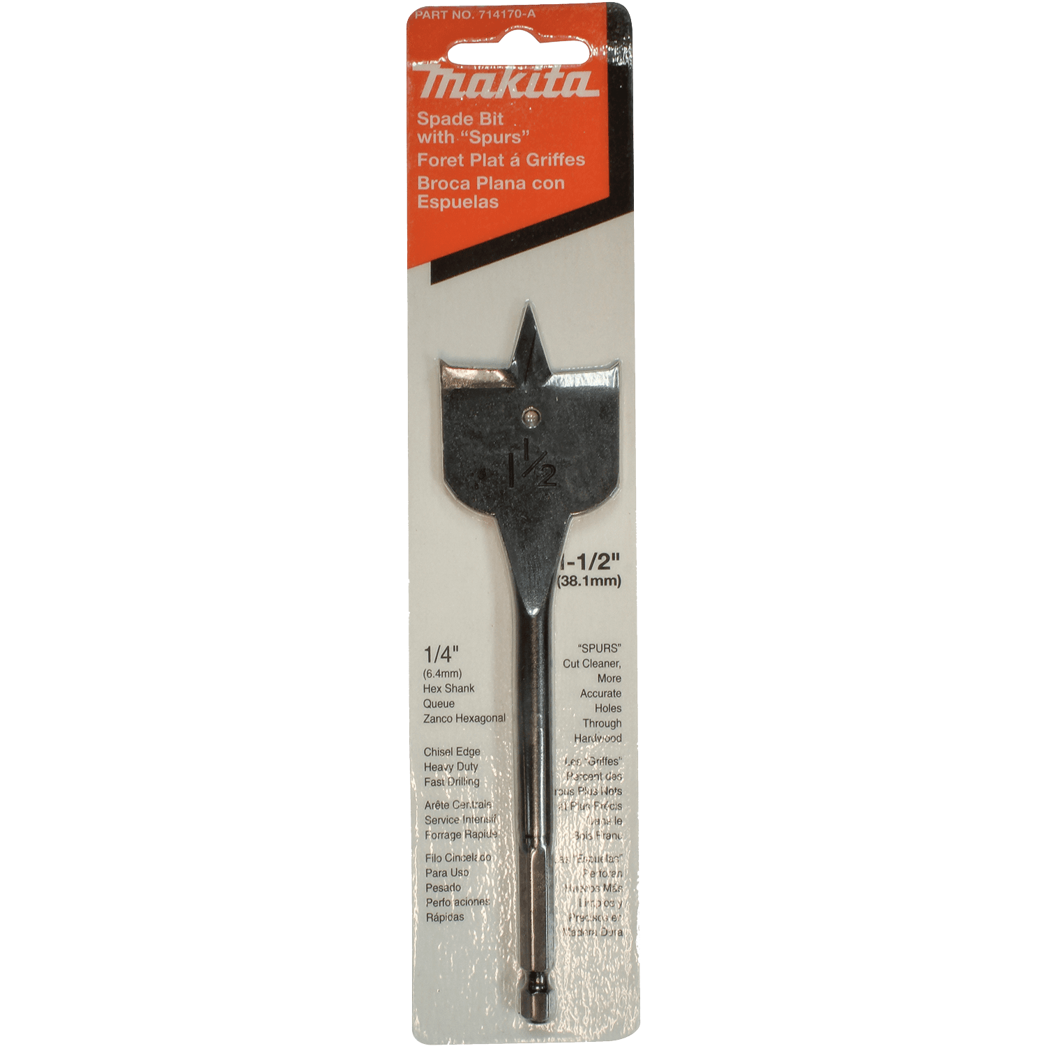 Makita Heavy Duty Spade Bits feature "spurs" that cut cleaner holes in wood. Durable construction allows these bits to hold up to the heaviest of applications. The versatile 1/4" hex shank allows these bits to easily be used in both impact drivers and driver-drills. Designed with "Spurs" for cleaner cuts and more accurate holes in hardwood. The chisel edge design is more positively angled and digs into the wood. Strong and durable for long lasting performance under heavy demands. Ideal for rough boring through wood. Convenient 1/4" hex shank.