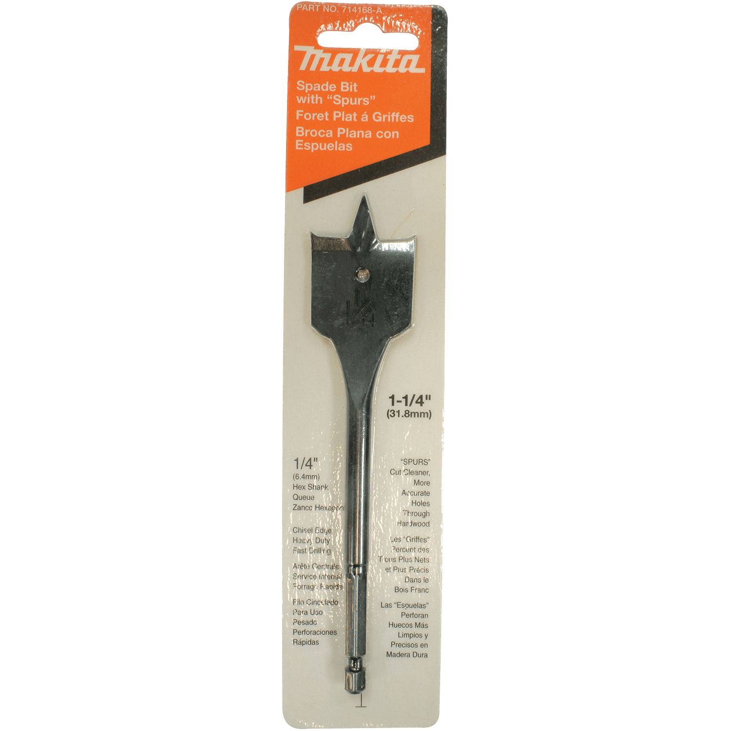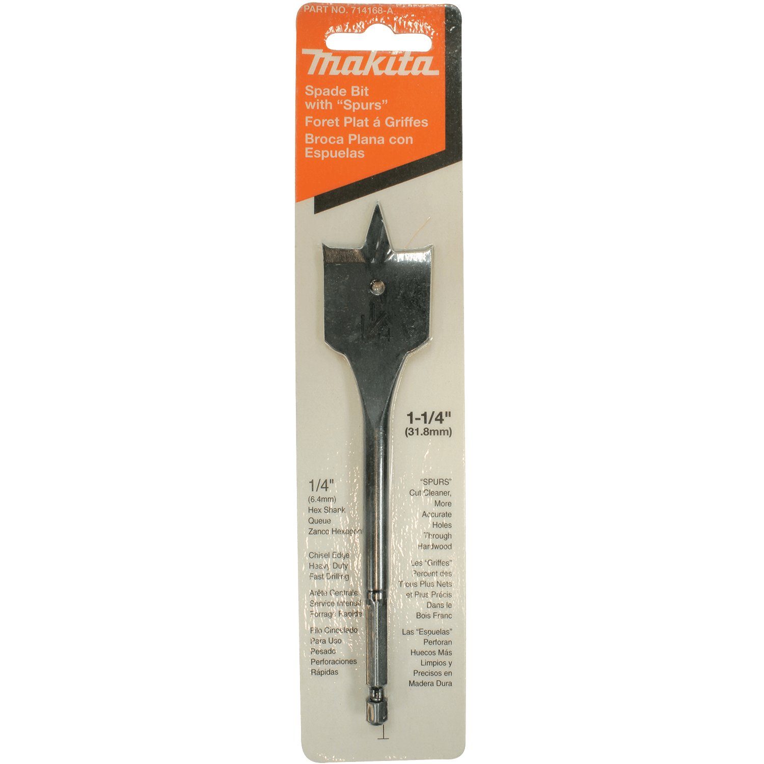 Makita Heavy Duty Spade Bits feature "spurs" that cut cleaner holes in wood. Durable construction allows these bits to hold up to the heaviest of applications. The versatile 1/4" hex shank allows these bits to easily be used in both impact drivers and driver-drills. Designed with "Spurs" for cleaner cuts and more accurate holes in hardwood. The chisel edge design is more positively angled and digs into the wood. Strong and durable for long lasting performance under heavy demands. Ideal for rough boring through wood. Convenient 1/4" hex shank.