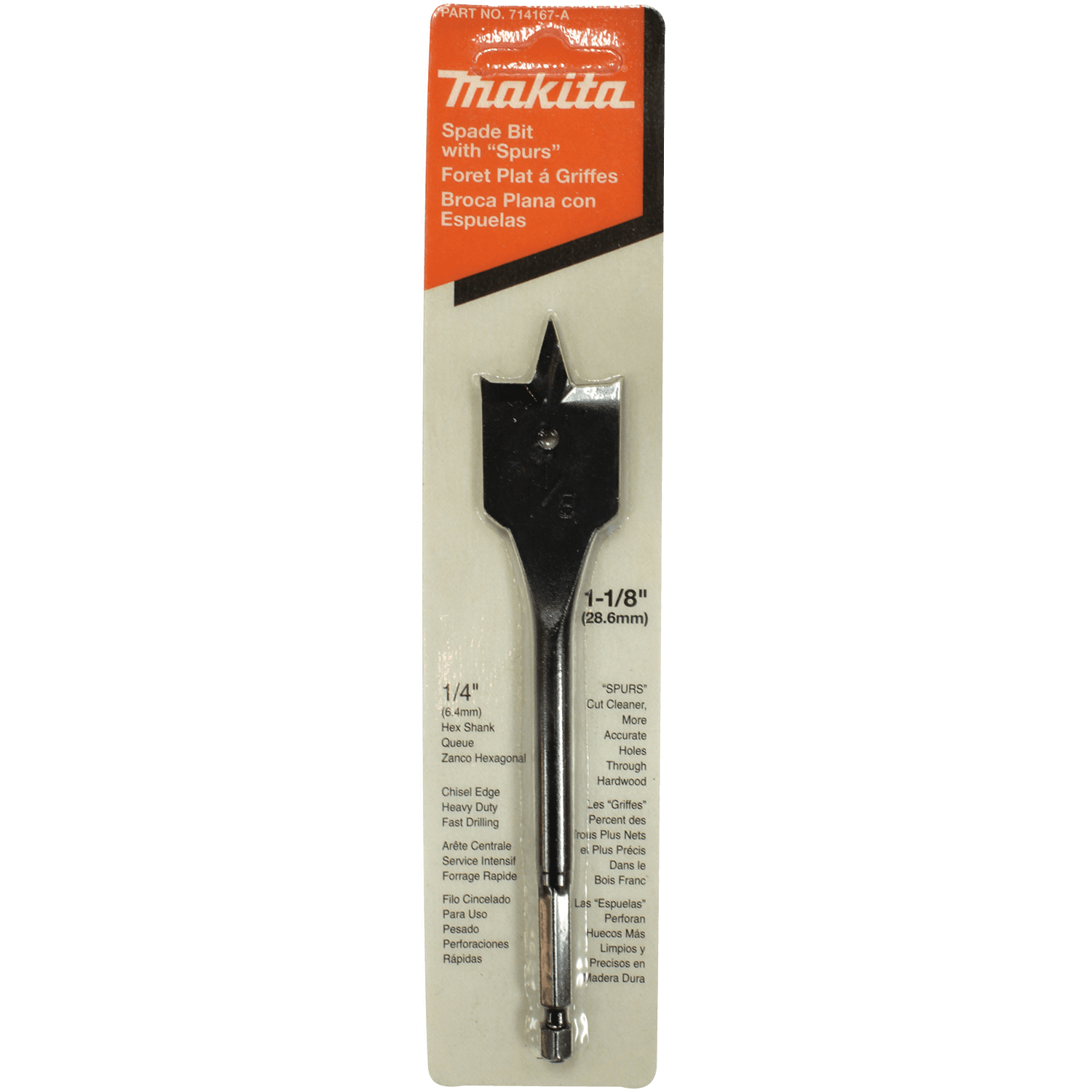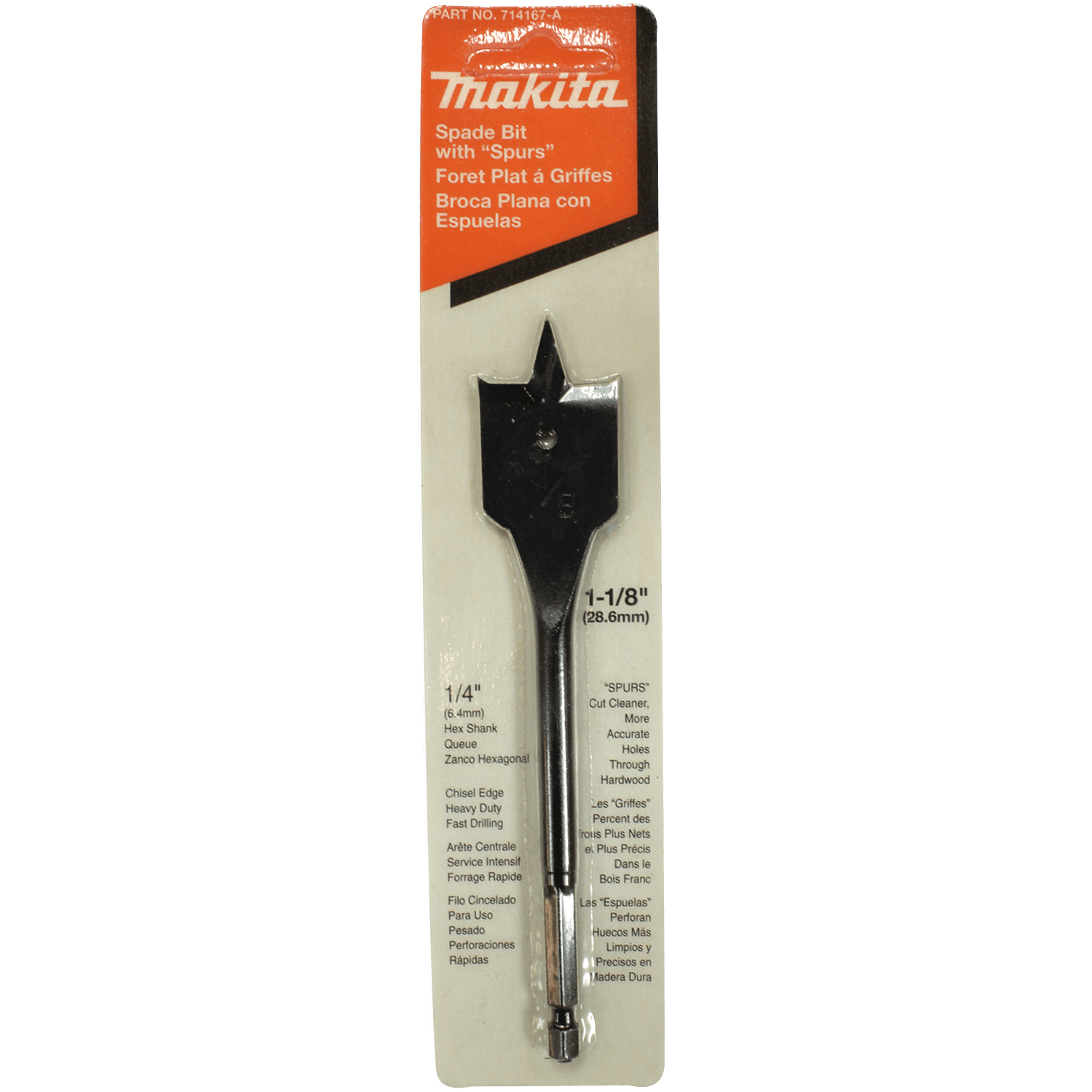 Makita Heavy Duty Spade Bits feature "spurs" that cut cleaner holes in wood. Durable construction allows these bits to hold up to the heaviest of applications. The versatile 1/4" hex shank allows these bits to easily be used in both impact drivers and driver-drills. Designed with "Spurs" for cleaner cuts and more accurate holes in hardwood. The chisel edge design is more positively angled and digs into the wood. Strong and durable for long lasting performance under heavy demands. Ideal for rough boring through wood. Convenient 1/4" hex shank.