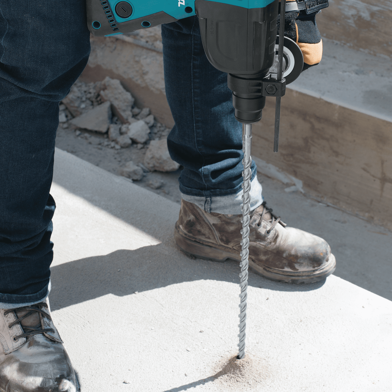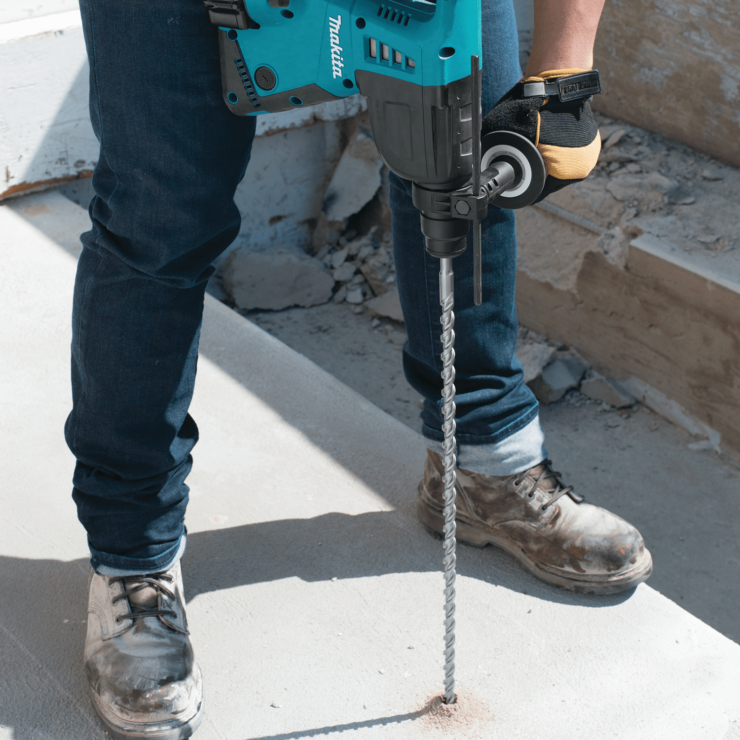 Makita Thruster® SDS-PLUS Rotary Hammer Bit is designed to be used with rotary hammers for drilling holes in concrete. The Thruster Style carbide tip and chamfers allow this bit to handle rebar with ease. Manufactured from high quality steel for added durability and long life. Thruster® Style carbide tip penetrates on contact and plows through rebar. Reinforced flute engineered for reduced vibration and faster dust removal. Dynamic chisel shaped head engineered to keep bit in contact with the material during drilling for faster penetration. Rebar chamfers help keep carbide from chipping. Self-centering tip is ideal for spot drilling. For drilling holes in concrete. 22" usable length. For use with rotary hammers that accept bits with SDS-PLUS shanks.