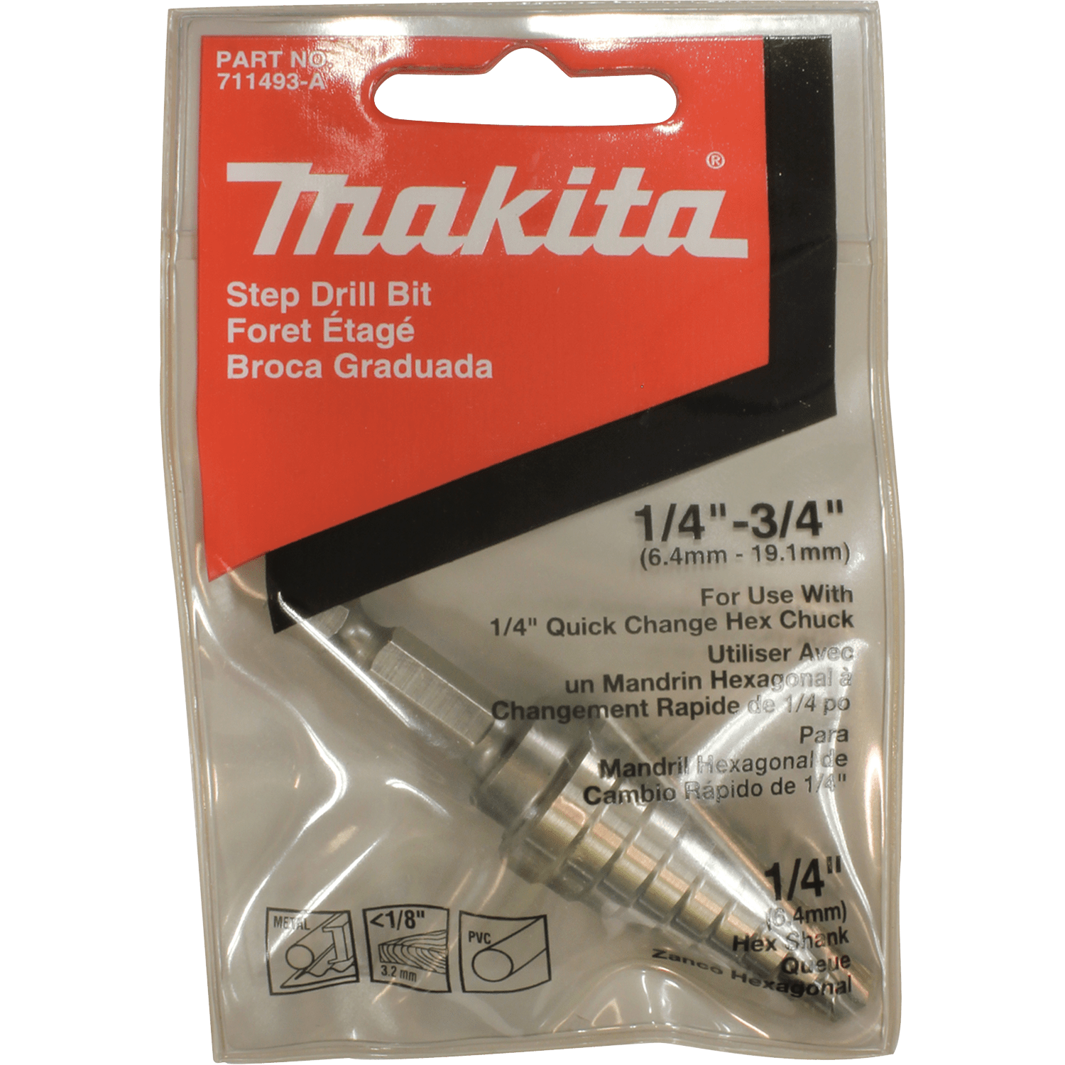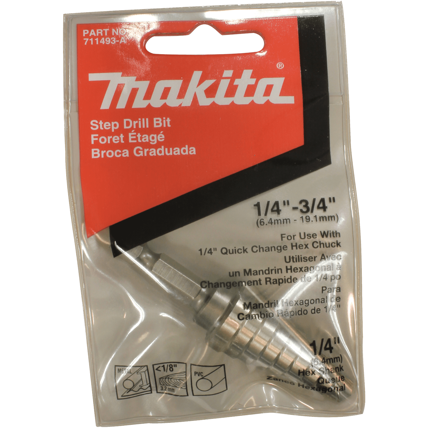 Makita Step Drill Bit is manufactured from high speed steel for longer life. Step Bit efficiently enlarges and deburs holes. 1/4" hex shank for convenient use with both Impact Drivers and Driver-Drills. 1/4" - 3/4" increments. Ideal for knockouts in electrical junction boxes and cabinets. Convenient 1/4" hex shank for quick bit changes with Impact Drivers. Durable high speed steel construction. Drills perfectly round holes in materials such as steel, brass, plastic, and wood.