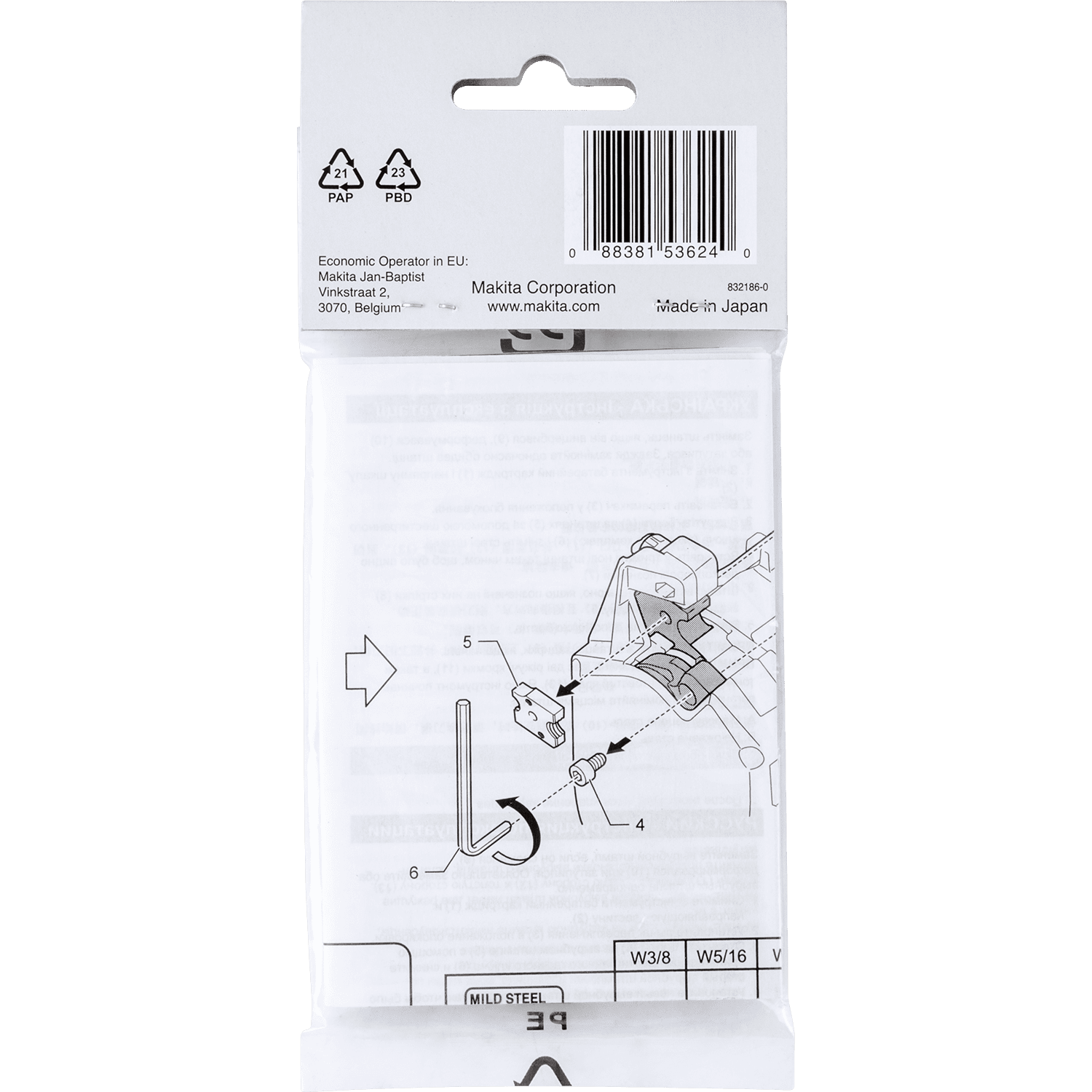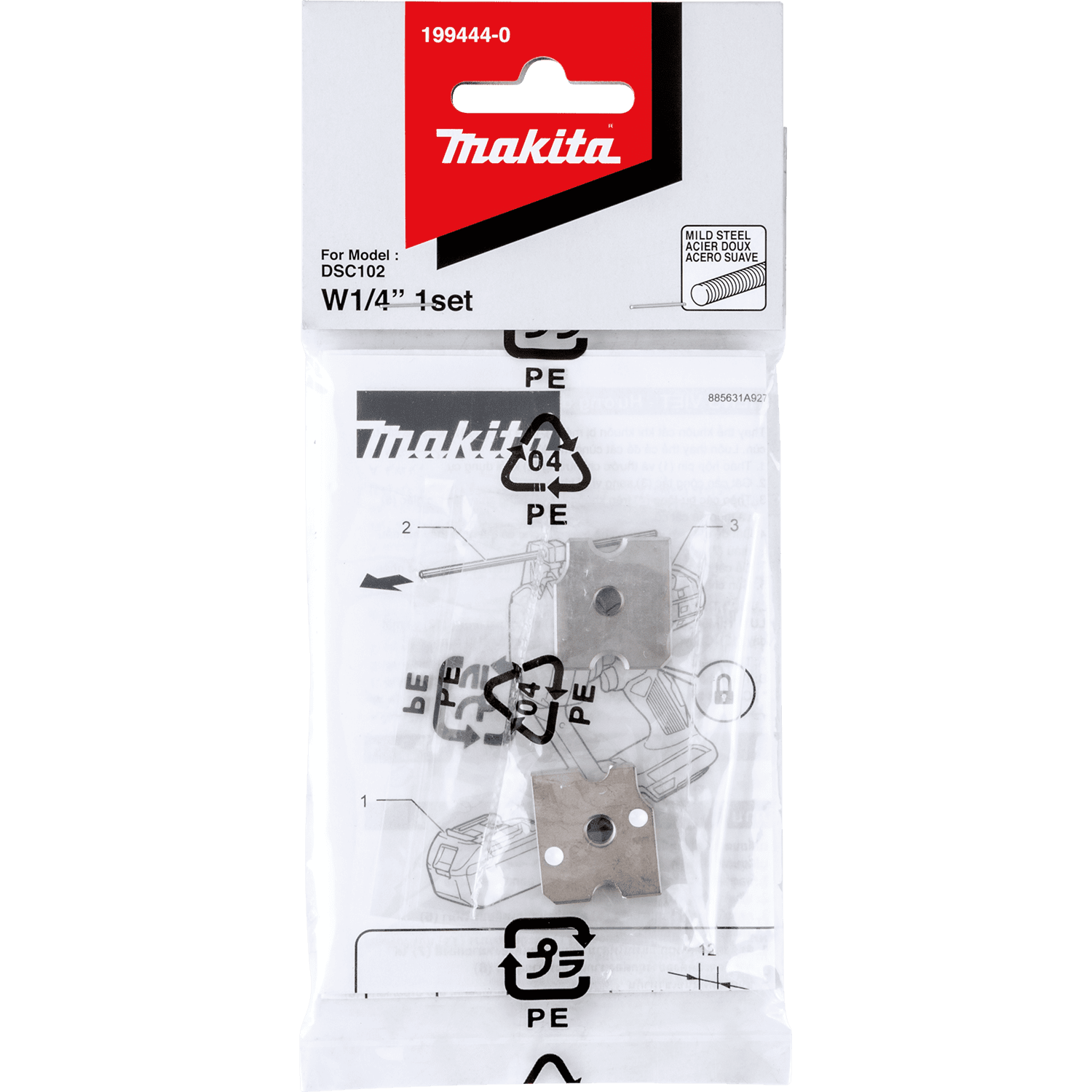 This replacement 1/4" Cutter Blade Set is for use with the Makita Cordless Threaded Rod Cutter (model XCS03). It is ideal for overhead cutting of installed threaded rod. The blades provide spark-free cuts that are clean and burr-free, allowing easy hand-threading of fastener or nut. The set features reversible double-edged cutting dies for twice the life of the blade. Spark-free cutting for clean, burr-free cuts allowing for easy threading. Reversible double-edged cutting dies for twice the life of the blade. Cuts 1/4” mild steel and 1/4” stainless steel coarse thread rod. Quick and easy installation for user convenience. For use with Makita Cordless Threaded Rod Cutter model XCS03Z.