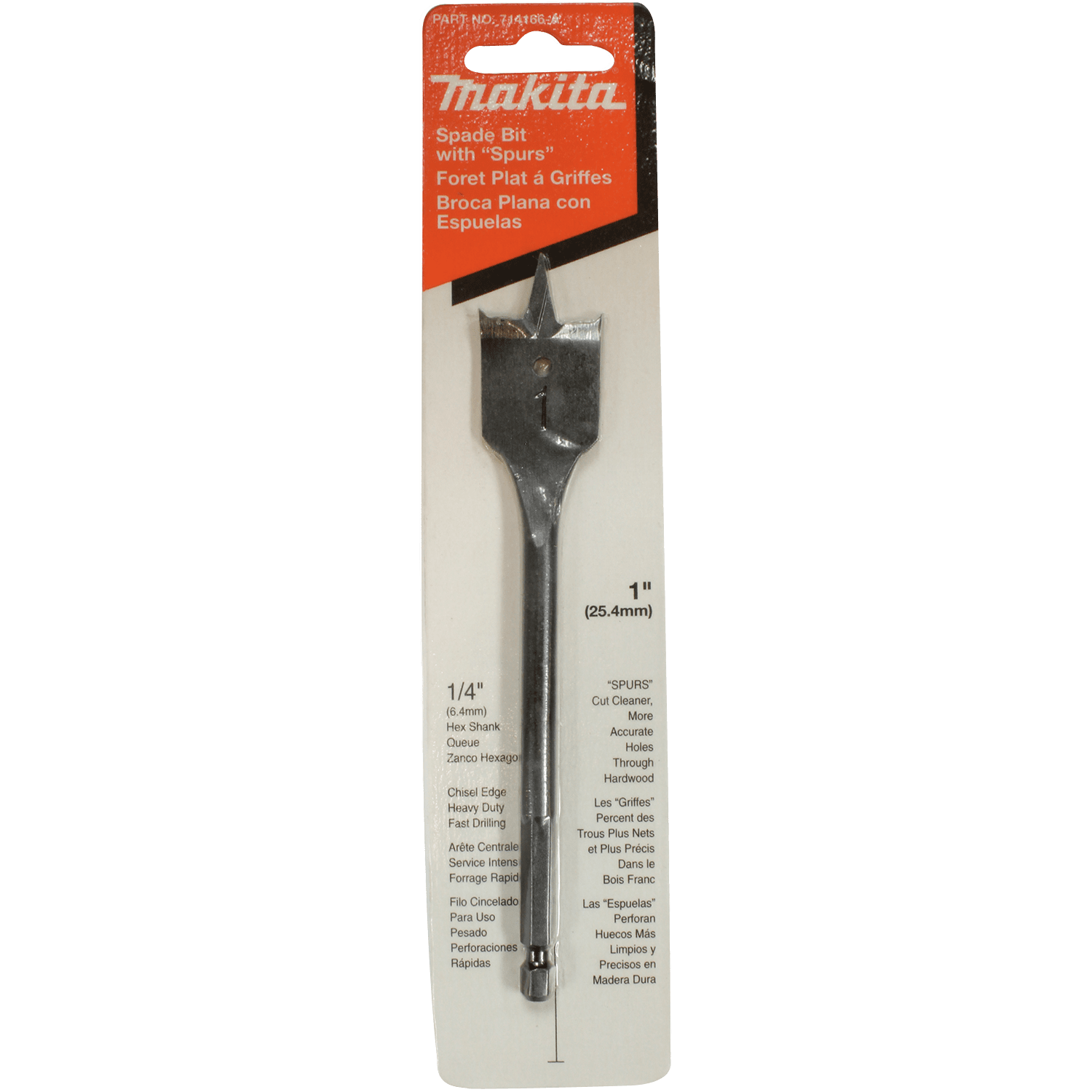 Makita Heavy Duty Spade Bits feature "spurs" that cut cleaner holes in wood. Durable construction allows these bits to hold up to the heaviest of applications. The versatile 1/4" hex shank allows these bits to easily be used in both impact drivers and driver-drills. Designed with "Spurs" for cleaner cuts and more accurate holes in hardwood. The chisel edge design is more positively angled and digs into the wood. Strong and durable for long lasting performance under heavy demands. Ideal for rough boring through wood. Convenient 1/4" hex shank.