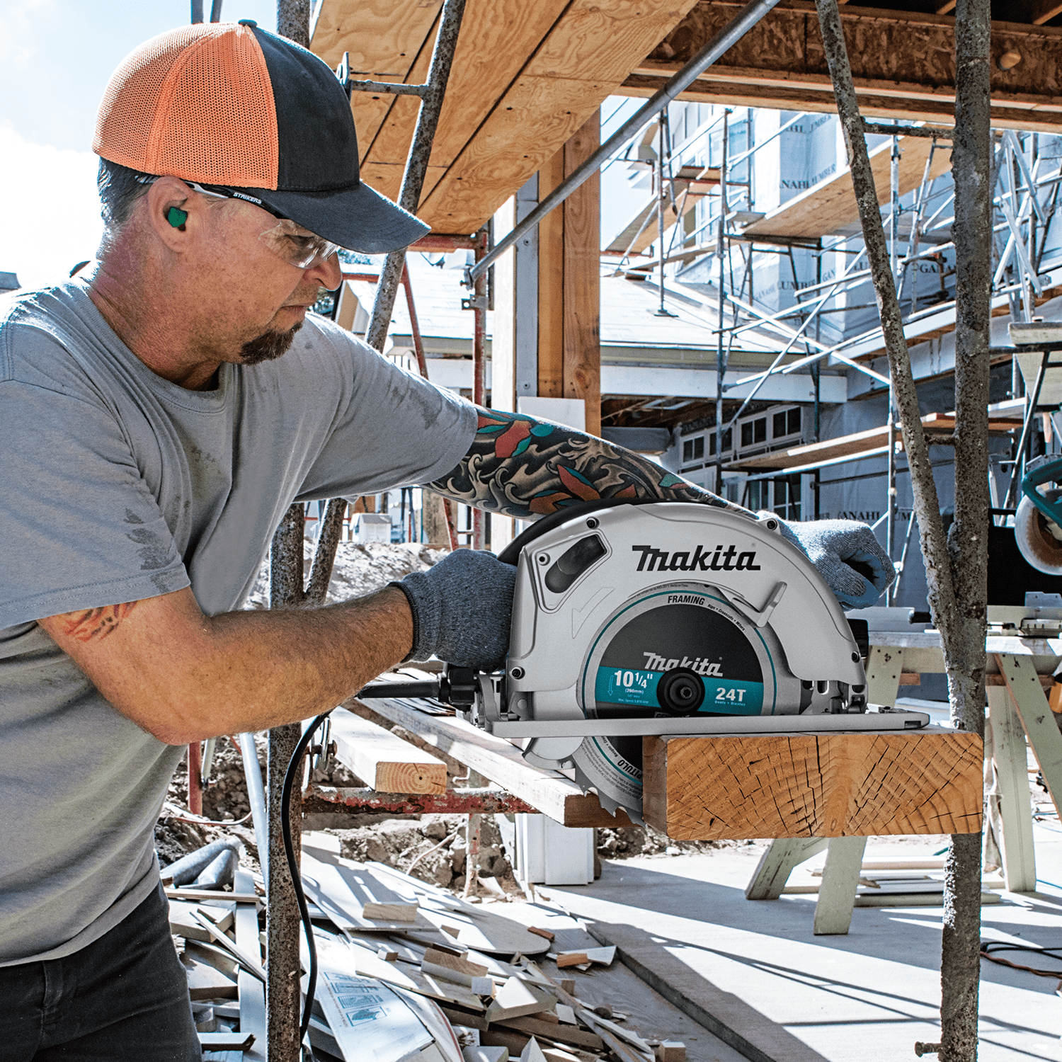 The Makita 5104 Circular Saw cuts 4x material in a single pass. It has a large cutting and bevel capacity (3-3/4 inches at 90 degrees and 2-3/4 inches at 45 degrees), and precision gearing with ball and needle bearing design. Convenience features include an electric brake and an adjustable top guide to align notches with line-of-cut for improved accuracy. The blade wrench is attached to the saw for fast blade changing, with a flat motor housing design for added convenience. The large, conveniently-located adjustment knobs and levers are engineered for easier adjustments. The 5104 has a well-balanced design and weighs only 18.3 pounds. Powerful 14 AMP motor delivers 3,800 RPM with power to cut beams and timber. Well balanced and weighs only 20.3 lbs. for increased operator comfort. Precision gearing with ball and needle bearing construction for smooth and efficient power transmission. Electric brake for maximum productivity. Large cutting and bevel capacity (3-3/4" at 90° and 2-3/4" at 45°). Blade wrench is attached to the saw for fast and convenient blade changing. Front, top and rear handles are positioned to fit hands comfortably for better control. Aluminum diecast blade case, blade guard, and base plate for durability. Double insulated. Includes blade, rip fence and wrench.