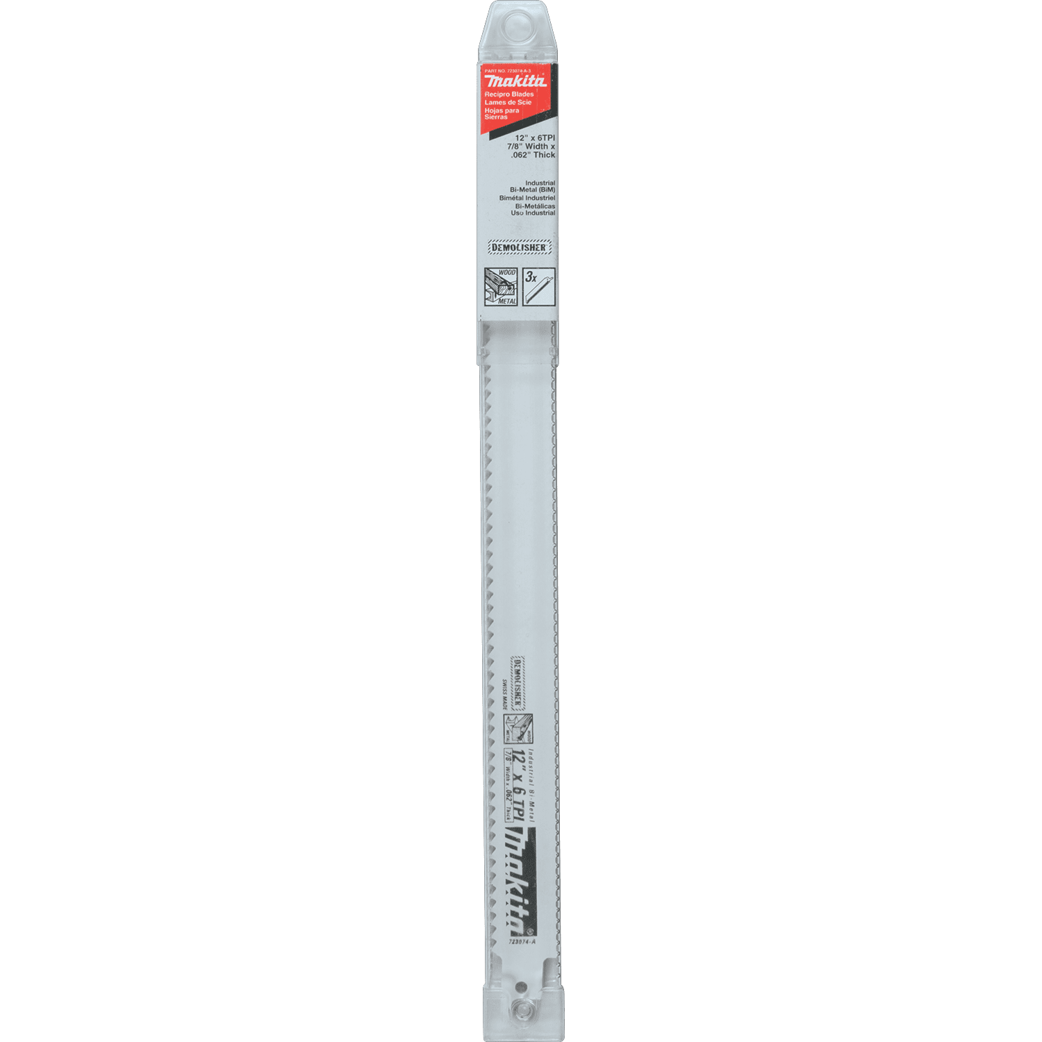 Makita Demolisherâ„¢ reciprocating saw blades are engineered for the most demanding of demolition applications. The fully reinforced teeth and cobalt content minimize teeth breakage and increases durability. Added blade thickness increases its resistance to bending. Cobalt content set to maximize blade durability and wear in high impact demolition applications. Additional 7/8 in. width increases blade life. First tooth consistently centered on each blade for straight plunge cuts. Fully reinforced teeth minimizes teeth breakage. .062 in. thickness increases resistance to bending. Bi-Metal construction lasts 10 times longer than HCS blades. For making demolition cuts without the blade bending in nail embedded wood and drywall.