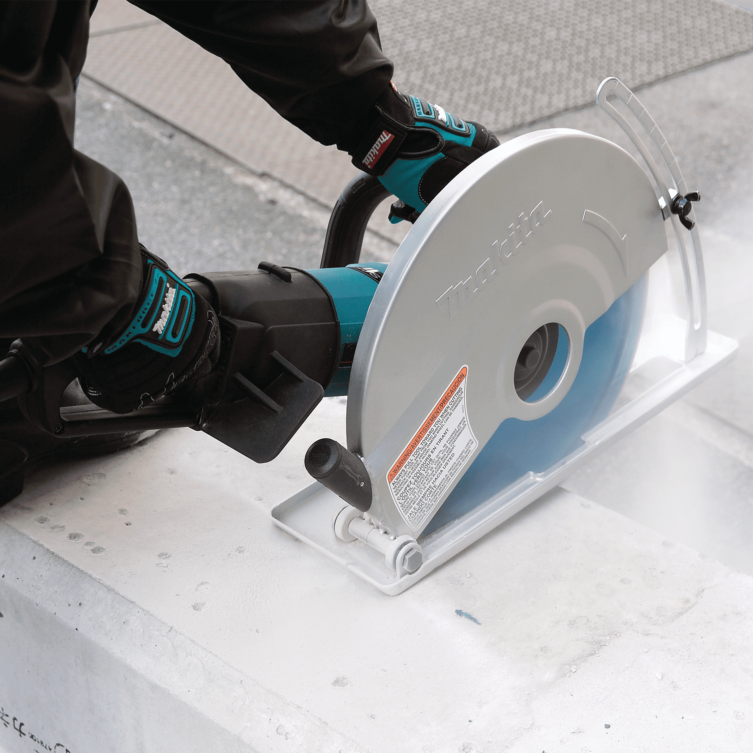 The Makita 14” Angle Cutter with 14” diamond blade (model 4114X) is a powerful concrete cutting solution engineered for a range of concrete cutting applications, and is ideal for edge-to-edge cuts. The 14” Angle Cutter is powered by a 15 AMP motor with 3,800 RPM for the most demanding jobs. The Angle Cutter offers increased versatility with a removable base for a closer edge-to-edge cut, and an adjustable tool base that allows for up to 5” cutting depth. Ease-of-use features include a built-in vacuum attachment port and rubber shield engineered to reduce dust and debris, a rubberized wraparound handle for increased comfort, and guide wheels on the tool guard for smoother cutting. The 4114X also includes a Makita 14” Optimum Diamond Blade. SJS™ technology is a mechanical clutch system that helps prevent motor and gear damage by allowing the drive shaft to slip if the wheel is forced to stop. Powerful 15.0 AMP motor delivers 3,800 RPM for the most demanding applications. AC/DC switch for use with alternative power source. Tool base can be removed for cutting closer to walls; guide wheels on the tool guard for smooth traveling. Built-in vacuum attachment port for efficient removal of dust and debris. Rubber shield helps keep debris away from operator and from entering the motor. Tool base adjusts allowing up to 5" cutting depth; best for cutting split face block when building retaining walls. Guide wheels on the tool guard ensure smooth traveling of tool over surface material when base is removed for cutting closer to walls. Positioning of the tool body can be adjusted (0°-80°) for operator comfort; operates independently of cutting depth for convenience and efficiency. Base has front and rear cutting guides for increased accuracy.