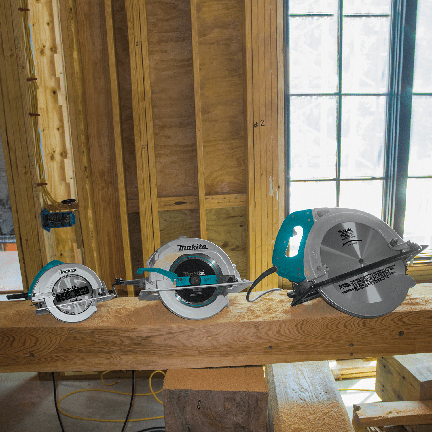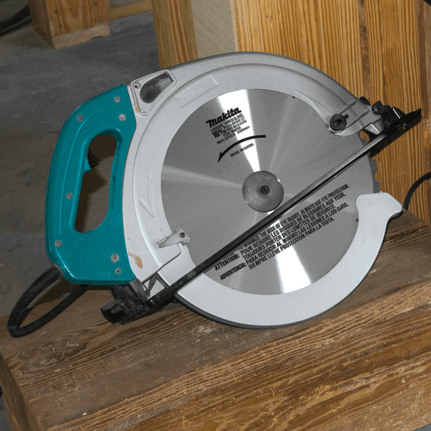 The Makita 16-5/16 in. Circular Saw is powered by a 15 AMP motor with 2,300 RPM, and has a large cutting capacity to handle beams, timber, and large pressure treated lumber. It will cut 6x material at 90 degrees and 4x material at 45 degrees in a single pass.The 5402NA features a shaft lock for quick blade changes, a large depth control lever for secure adjustments, and an oversized trigger handle for added convenience. Other features include lower noise (only 87 dB), and a blade stabilizer for consistent blade rotation. Includes a carbide tipped blade. Powerful 15 AMP motor delivers 2,300 RPM for enough power to cut through pressure treated lumber. Cuts 6x material at 90° and 4x material at 45° in a single pass. Weighs only 32.1 lbs. for increased operator comfort. Electric brake for maximum productivity. Ideal for cutting large timber, pressure treated lumber and wood logs. Large capacity blade cuts 6-3/16" at 90° and 4-3/16" at 45°. Low noise level at only 87dB for quieter operation. Blade stabilizer for stable blade rotation and superior cutting performance. Large depth control lever for convenience and secure adjustments. Large support handle for increased operator comfort and control.