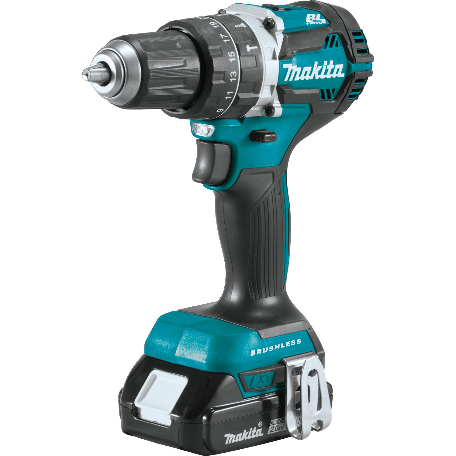 The Makita 18V LXT® Lithium-Ion Brushless Cordless ½” Hammer Driver-Drill (XPH12R) is an ideal drilling and driving solution for the user who wants more features. The XPH12R combines 530 in.lbs. of Max Torque with an efficient brushless motor that delivers up 50% more work per charge, increased power and speed, and longer tool life. For the pro user, this means more drilling and driving power, greater productivity, and fewer trips up and down the scaffolding or ladder to get to the battery charger. In driver mode, the adjustable torque settings provide more control for a full range of applications, from large fasteners to smaller, delicate screws. For drilling into masonry, simply switch to the percussive hammer driver-drill setting. It weighs only 3.6 lbs. (with 18V 2.0Ah battery) for increased comfort and superior power-to-weight ratio. The kit includes two efficient 18V LXT® Compact 2.0Ah batteries, and each reach a full charge in only 25 minutes – the fastest charge-time in the category – for less downtime and increased productivity. It’s part of Makita’s expanding 18V Lithium-Ion series, the world’s largest cordless tool line-up powered by 18V Lithium-Ion slide-style batteries. Makita 18V Lithium-Ion batteries have the fastest charge times in their categories, so they spend more time working and less time sitting on the charger. For improved tool performance and extended battery life, Makita created Star Protection Computer Controls™. Star Protection is communication technology that allows the Star Protection-equipped tool and battery to exchange data in real time and monitor conditions during use to protect against overloading, over-discharging and overheating. For increased versatility, the tool can also be powered by Makita 18V LXT® and Compact Lithium-Ion batteries with the star symbol on the battery indicating Star Protection inside. Variable 2-speed design (0-500 & 0-2,000 RPM) (0-7,500 & 0-30,000 BPM) covers a wide range of drilling, driving and hammer applications. BL™ Brushless Motor delivers 530 in.lbs. of Max Torque. Efficient BL™ Brushless motor is electronically controlled to optimize battery energy use for up to 50% longer run time per charge. The BL™ Brushless Motor eliminates carbon brushes, enabling the BL™ Motor to run cooler and more efficiently for longer life. The electronically-controlled BL™ Brushless Motor efficiently uses energy to match torque and RPM to the changing demands of the application. Features Extreme Protection Technology (XPT™) which is engineered to provide increased dust and water resistance in harsh job site conditions. Compact and ergonomic design at only 7-1/8" long. Weighs only 3.5 lbs. with battery for reduced operator fatigue. Rubberized soft grip provides increased comfort on the job. Dual L.E.D. lights illuminate the work area. All metal gear housing for increased job site durability. 18V LXT® Lithium-Ion 2.0Ah battery BL1820B provides up to 50% more run time per charge*. 18V LXT® Lithium-Ion 2.0Ah battery BL1820B reaches a full charge in 25 minutes or less. Equipped with Star Protection Computer Controls™ to protect against overloading, over-discharging and over-heating. Rapid Optimum Charger communicates with the battery's built-in chip throughout the charging process to optimize battery life by actively controlling current, voltage and temperature. Rapid Optimum Charger has a built-in fan to cool the battery for faster, more efficient charging. Makita technology delivers category-leading charge time, so the battery spends more time working and less time sitting on the charger. Compatible with Makita 18V Lithium-Ion batteries with a Star symbol. 3-year limited warranty on tool, battery and charger. Only use genuine Makita batteries and chargers. *compared to BL1815..