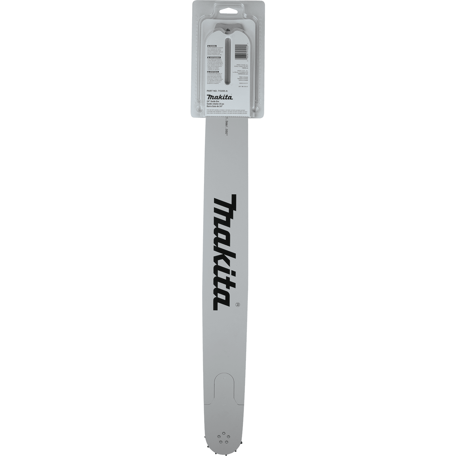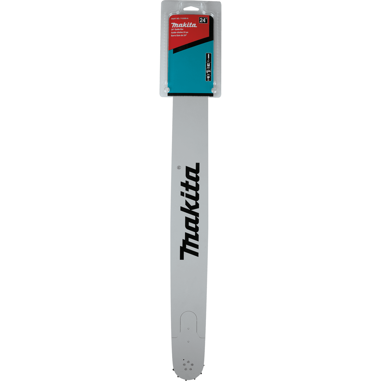 Get the right guide bar replacement for your chain saw. The Makita 24” Guide Bar (713205-A) features a small radius replaceable nose for improved maneuverability, and it fastens with a single rivet for added convenience. Additional features include oil holes designed for reduced plugging and an oil-retaining feature for improved bar and chain lubrication. The chrome-moly steel construction is engineered for reduced wear and chipping for longer guide bar life. Replaceable bar nose fastens with a single rivet. Oil holes designed to reduce plugging and oil retaining feature for improved bar and chain lubrication. Chrome-moly steel improves body strength and tough rails reduce wear and chipping. Small radius replaceable nose can be easily replaced.