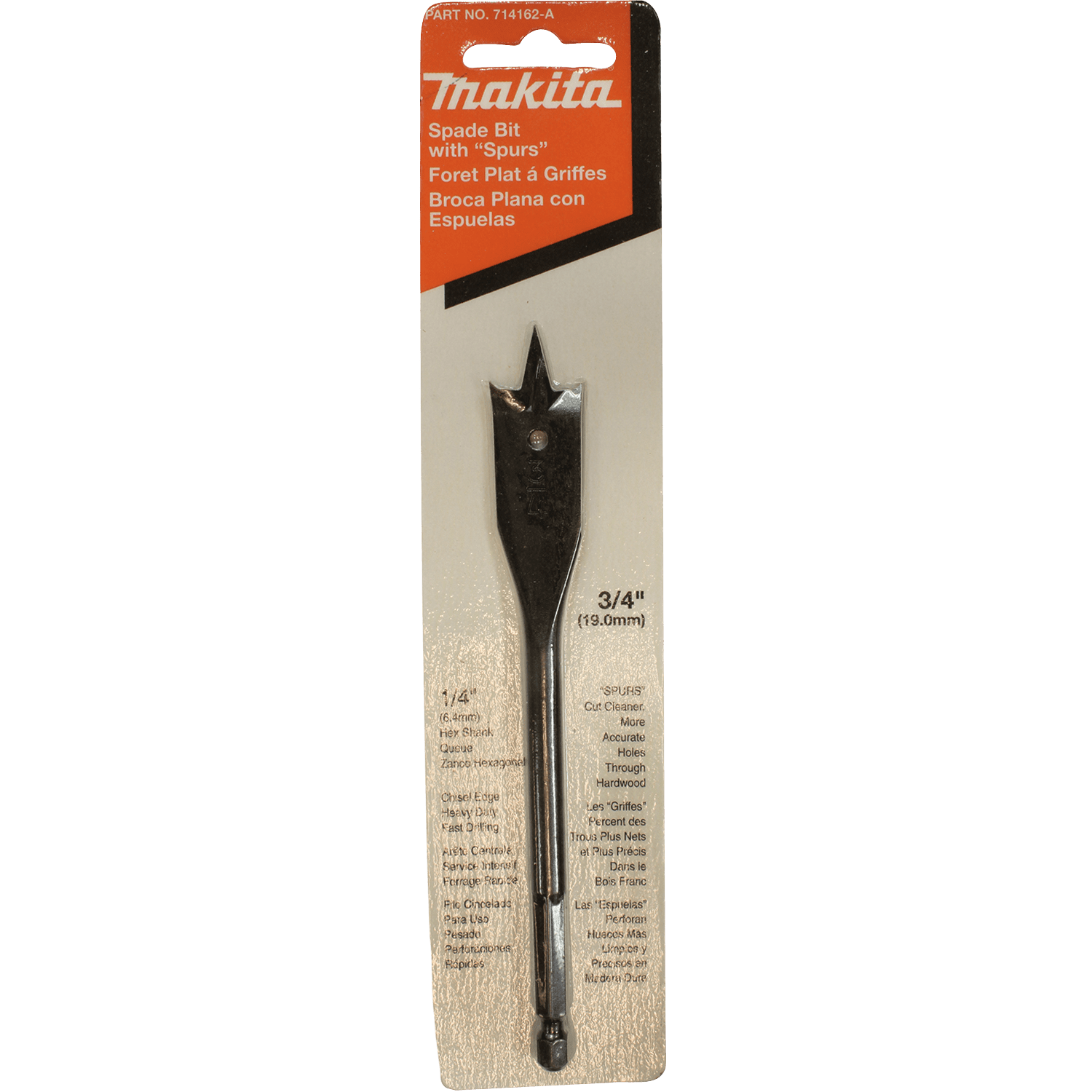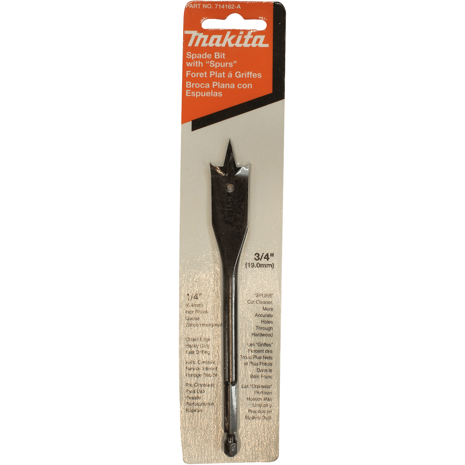 Makita Heavy Duty Spade Bits feature "spurs" that cut cleaner holes in wood. Durable construction allows these bits to hold up to the heaviest of applications. The versatile 1/4" hex shank allows these bits to easily be used in both impact drivers and driver-drills. Designed with "Spurs" for cleaner cuts and more accurate holes in hardwood. The chisel edge design is more positively angled and digs into the wood. Strong and durable for long lasting performance under heavy demands. Ideal for rough boring through wood. Convenient 1/4" hex shank.