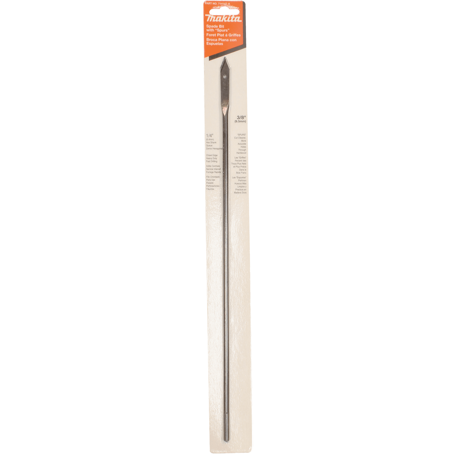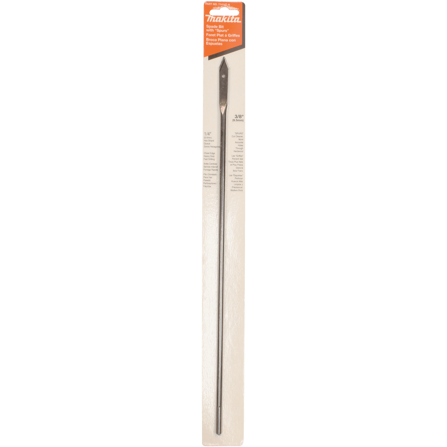 Makita Heavy Duty Spade Bit features "spurs" that cut cleaner holes in wood. Durable construction allows the Bit to hold up to the heaviest of applications. The versatile 1/4" hex shank allows the Bit to easily be used in both Impact Drivers and Driver-Drills. The aggressive chisel edge means faster, more accurate drilling. Designed with "Spurs" for cleaner cuts and more accurate holes in hardwood. The chisel edge design is more positively angled and digs into the wood. Made from durable, high strength steel for long lasting performance under heavy demands. Ideal for rough boring through wood. Extra long 16" length for added reach. 1/4" hex shank works directly with Impact Drivers and Driver-Drills