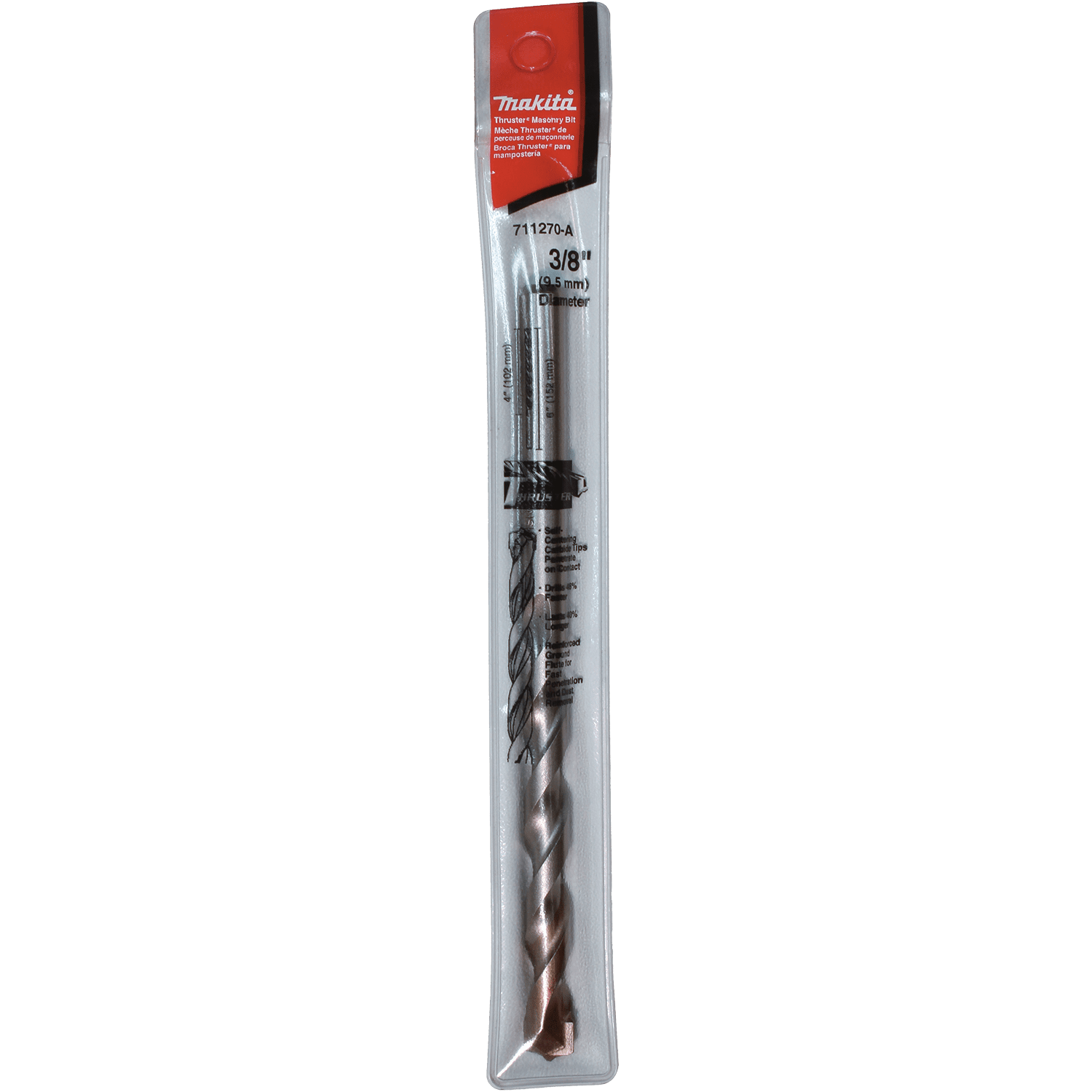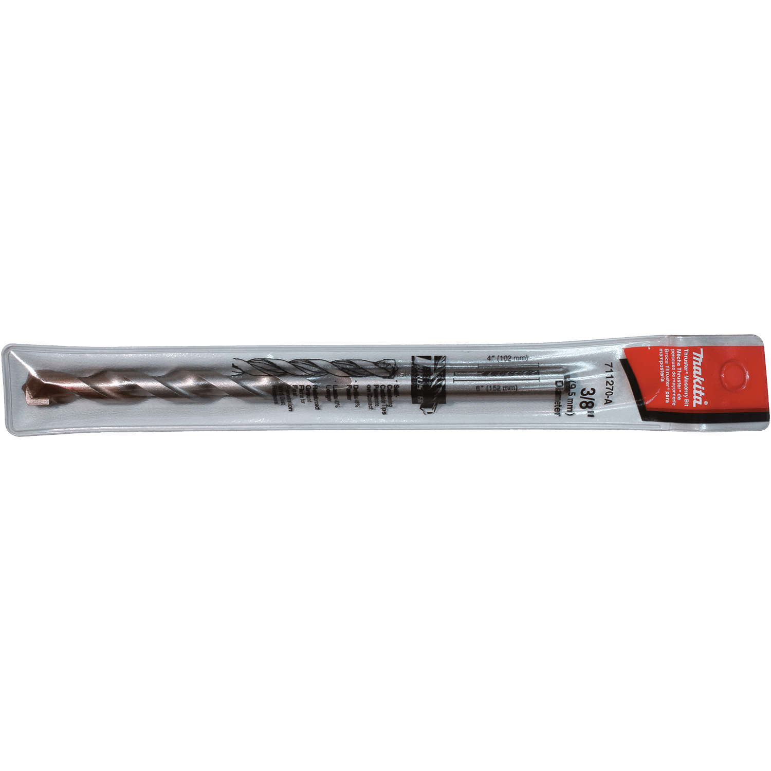 Makita Thruster® Percussion Hammer Bits are designed to work with corded and cordless hammer drills for drilling holes in brick and other masonry materials. Each bit features carbide tips for added durability and long life. The Thruster style tip and aggressive cutting edge for fast and easy penetration. Thruster® style carbide tip engineered to penetrate on contact and plow through rebar. Special heat-treated high alloy steel for longer bit life. Thruster® style reinforced ground flute for efficient dust removal. Aggressive cutting edge for fast and easy penetration. Resharpenable for extended bit life. For use in corded and cordless hammer drills for drilling holes in masonry materials.