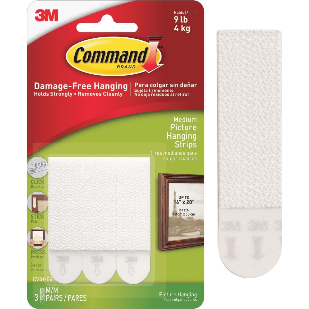 Command interlocking picture hanging strips make decorating quick and easy. One click tells you picture hanging strips are locked in and holding tight. Best of all, when you are ready to take down or move your pictures, they come off leaving no wall damage, cracked plaster or sticky residue. Command interlocking picture hanging strips come in 3 sizes: Small strips hold most 8 x 10 frames, medium strips hold most 18 x 24 frames and large strips hold most 24 x 36 frames.
