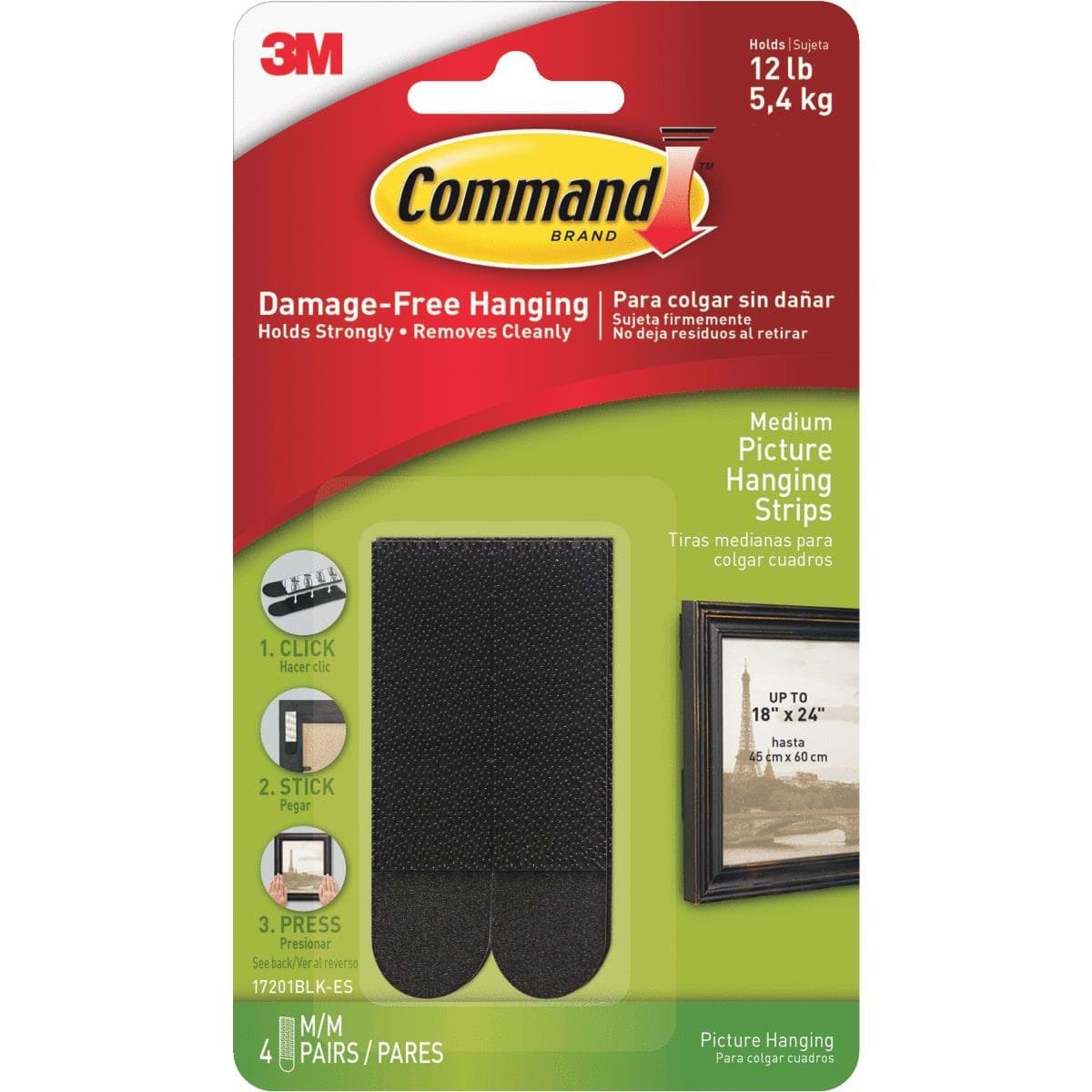 Command interlocking picture hanging strips make decorating quick and easy. One click tells you picture hanging strips are locked in and holding tight. Best of all, when you are ready to take down or move your pictures, they come off leaving no wall damage, cracked plaster or sticky residue. Command interlocking picture hanging strips come in 3 sizes: Small strips hold most 8 x 10 frames, medium strips hold most 18 x 24 frames and large strips hold most 24 x 36 frames.