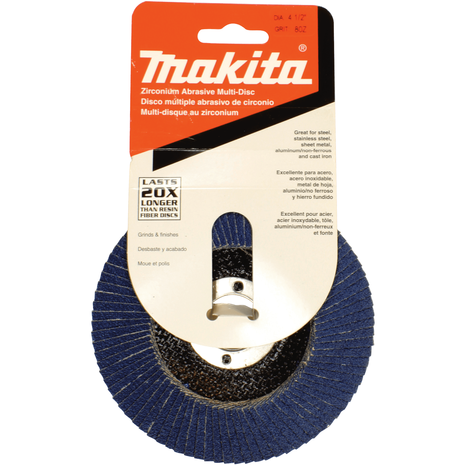 Makita 4-1/2" Abrasive Multi-Disc is designed to work with Angle Grinders for material removal and surface preparation. The Zirconium abrasive grain runs cooler and lasts longer than aluminium oxide. These wheels work on a variety of materials including metal, wood and plastic. General Purpose for metal, wood and plastic. 80 Grit; 7/8" arbor hole. Zirconium abrasive grain provides consistent high cut rate; Last up to 20x longer than resin fiber discs. Phenolic backing prevents backing from scratching surface. Angled design ensures 90% of the abrasive material is in contact with the work surface; works at a 10º to 25º angle. For use with 4-1/2" Angle Grinders.
