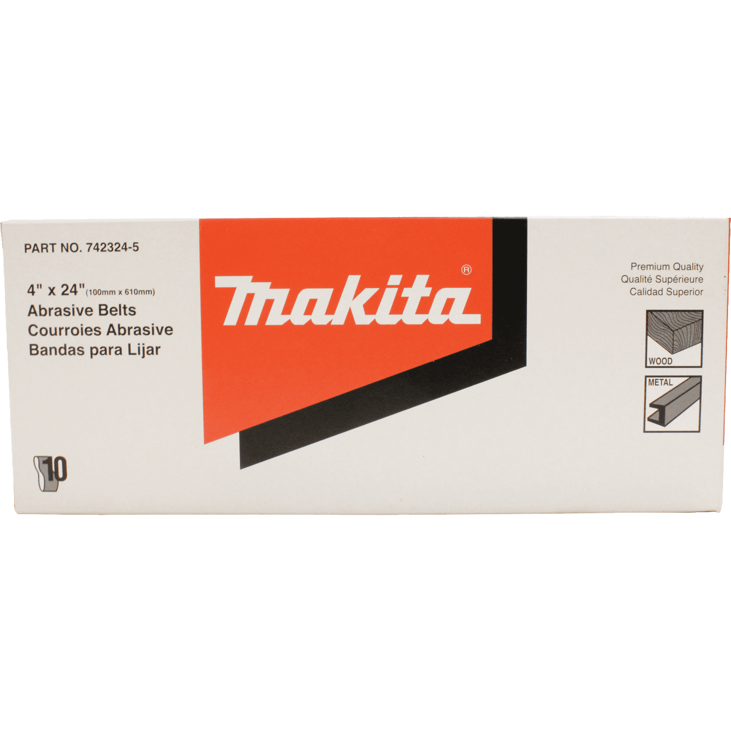 Makita abrasive belts feature a heavyweight backing pad for increased life and more efficient sanding. The versatile aluminum-oxide grain abrasive makes these belts ideal for a variety of materials including wood and metal. These Makita abrasive belts make quick work of removing material including paint. High quality aluminum-oxide grain abrasive for increased durability and sharpness. Open-coat grain distribution and resin glue coating reduces grain clogging and improves finish on wood surfaces. Heavyweight backing reduces edge tear-out for more sanding. Ideal for quick removal of material in large sections of wood and metal. For use with Makita 4" x 24" Belt Sander.