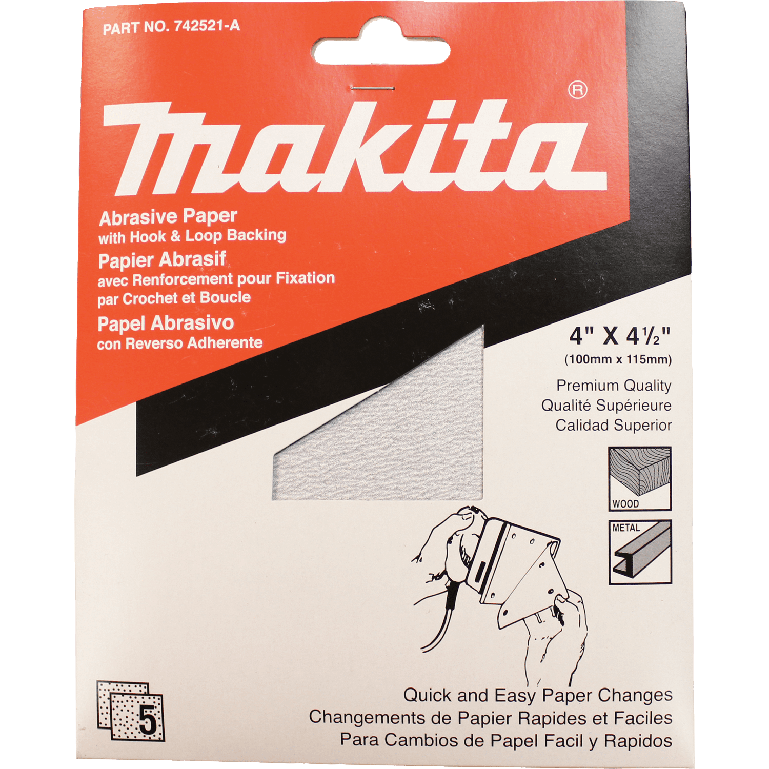 Makita 4" x 4-1/2" Hook and Loop Abrasive Paper sheets are designed to work with 1/4 Sheet Finishing Sanderss with hook and loop backing pads for use in a variety of sanding applications. The paper features high quality backing material for added durability and more efficient sanding. Each sheet of paper features high quality abrasives for quicker and more efficient removal of material. High-quality white aluminum oxide grain abrasive for increased durability and sharpness. Open-coat grain distribution and resin glue coating reduces grain clogging and improves finish on wood surfaces. Heavyweight paper provides strong backing and reduces edge tear-out for more sanding. Ideal for use on bare wood, paint, varnish, fillers, plastic and other materials. For use with 1/4 Sheet Finishing Sanders with a hook and loop backing pad.