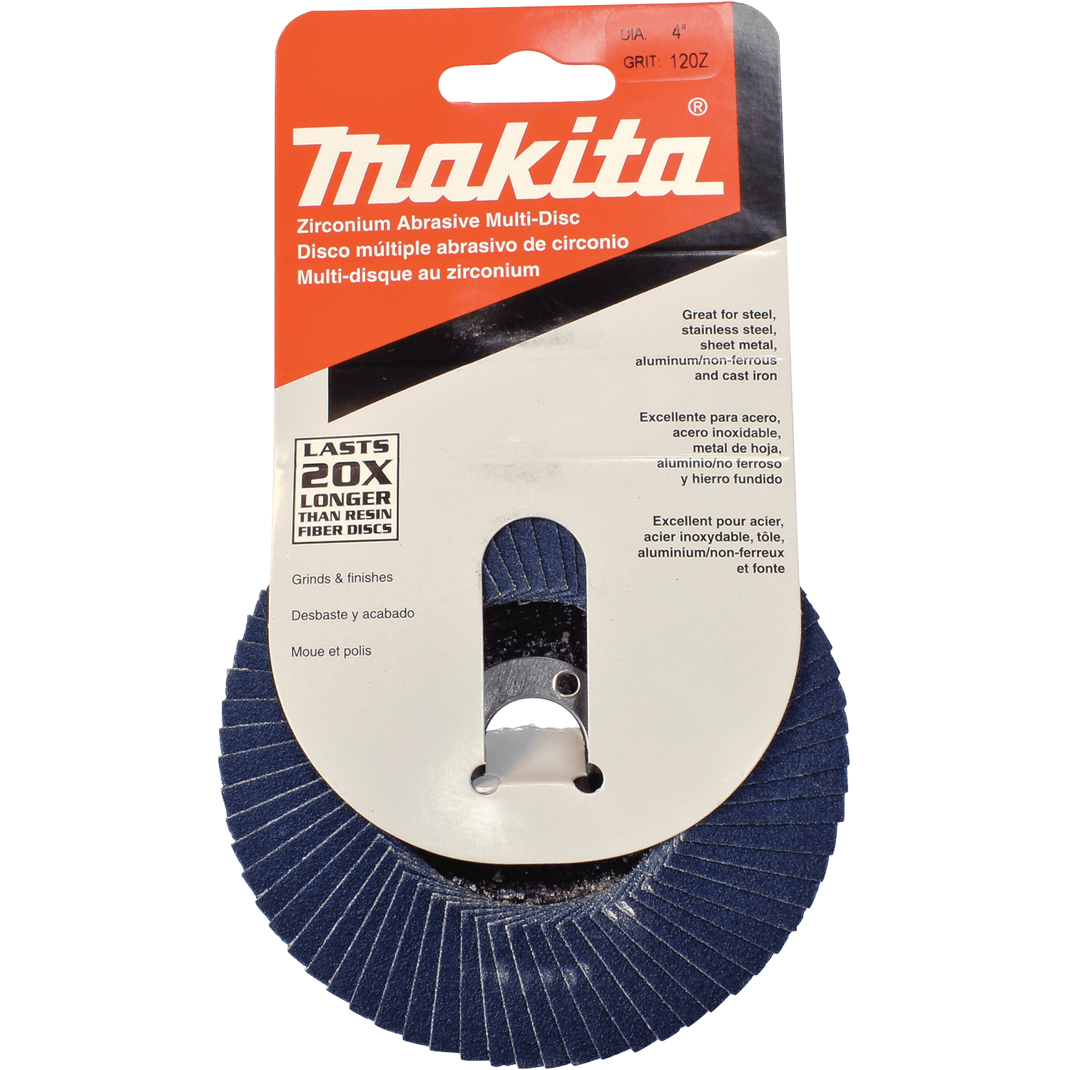 Makita 4" Abrasive Multi-Disc is designed to work with Angle Grinders for material removal and surface preparation. The Zirconium abrasive grain runs cooler and lasts longer than aluminium oxide. These wheels work on a variety of materials including metal, wood and plastic. General Purpose for metal, wood and plastic. 120 Grit; 5/8" arbor hole. Zirconium abrasive grain provides consistent high cut rate; Last up to 20x longer than resin fiber discs. Phenolic backing prevents backing from scratching surface. Angled design ensures 90% of the abrasive material is in contact with the work surface; works at a 10º to 25º angle. For use with 4" Angle Grinders.