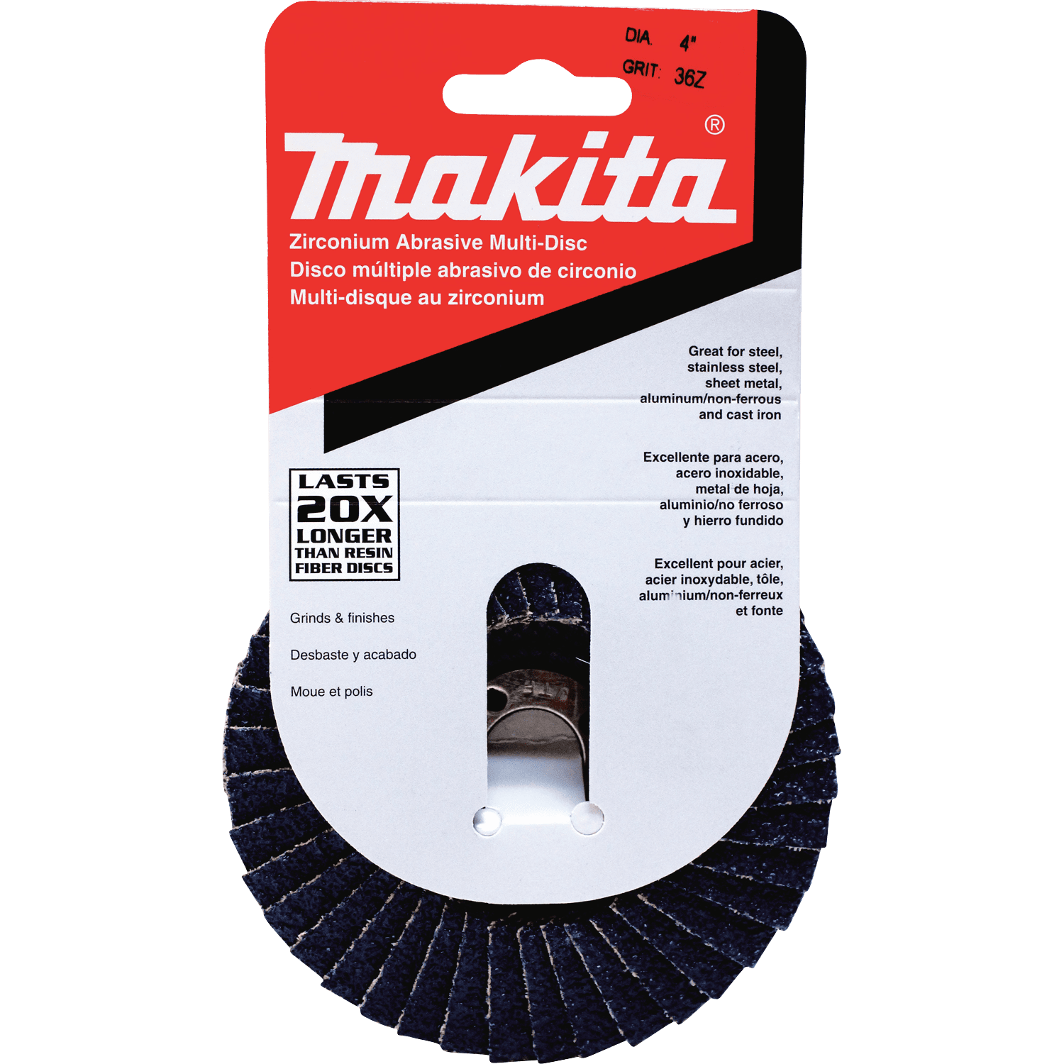 Makita 4" Abrasive Multi-Disc is designed to work with Angle Grinders for material removal and surface preparation. The Zirconium abrasive grain runs cooler and lasts longer than aluminium oxide. These wheels work on a variety of materials including metal, wood and plastic. General Purpose for metal, wood and plastic. 36 Grit; 5/8" arbor hole. Zirconium abrasive grain provides consistent high cut rate; Last up to 20x longer than resin fiber discs. Phenolic backing prevents backing from scratching surface. Angled design ensures 90% of the abrasive material is in contact with the work surface; works at a 10º to 25º angle. For use with 4" Angle Grinders.