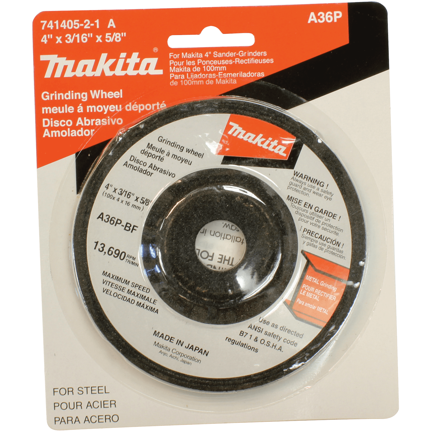 Makita 4" Abrasive Grinding Wheels feature an innovative grain structure engineered for optimum performance, efficient material removal and longer wheel life. These type 27 wheels are constructed of high quality aluminum oxide abrasive grains for increased performance and added durability. These wheels are designed to be used on most 4" Angle Grinders for general grinding of ferrous metals. General Purpose - Ideal for grinding ferrous metal. 36 Grit; 3/16" thick; 5/8" arbor hole. Constructed with aluminum oxide grade A24. For use with 4" Angle Grinders.