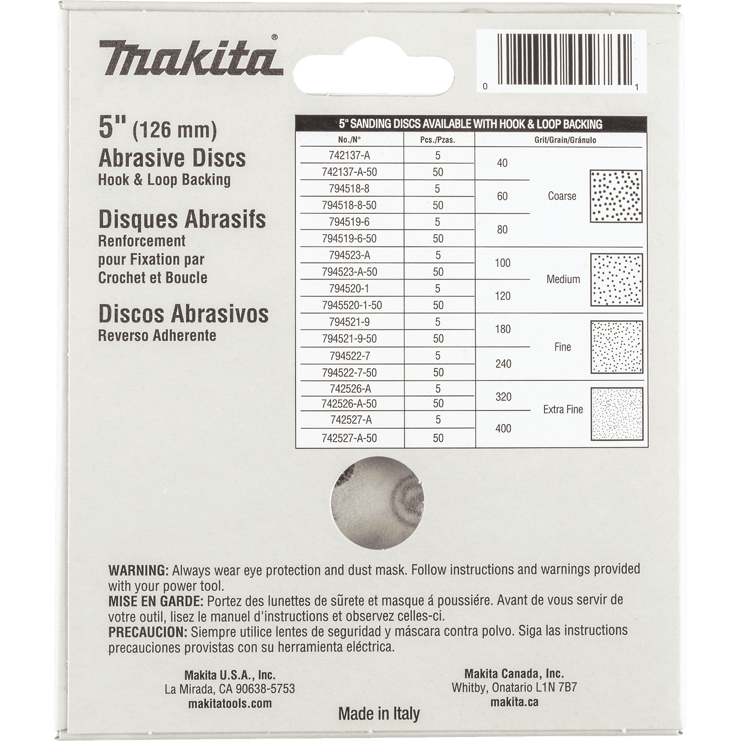 Each disc is heat and moisture resistant due to a double resin binder. The strong backing is resistant to delaminating and tearing. Open coated grain distribution combined with calcium stearate coating enables the abrasive to avoid clogging thereby extending the life of the paper and achieving an excellent surface finish. Makita discs are ideal for a wide range of applications including: wood, paint removal, varnish, fillers, plastics and more. High-quality white aluminum oxide grain abrasive for increased durability and sharpness. Open-coat grain distribution and resin glue coating reduces grain clogging and improves finish on wood surfaces. Heavyweight paper provides strong backing and reduces edge tear-out for more sanding. Ideal for use on bare wood, paint, varnish, fillers, plastic and other materials. 8-Hole design fits most 5” Random Orbit Sanders.