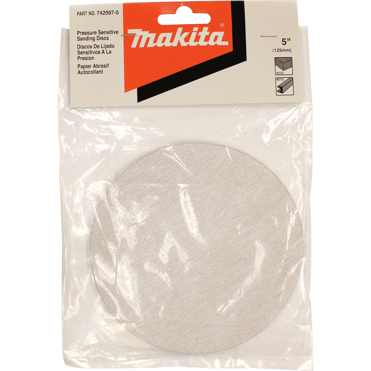 Makita Pressure Sensitive Adhesive (PSA) Abrasive Disc is designed to work with Random Orbit Sanders to sand a variety of wood surfaces. The paper features an adhesive back for quick changes. Each Disc features high quality backing material for added durability and more efficient sanding. High-quality white aluminum oxide grain abrasive for increased durability and sharpness. Open-coat grain distribution and resin glue coating reduces grain clogging and improves finish on wood surfaces. Heavyweight paper provides strong backing and reduces edge tear-out for more sanding. Ideal for use on bare wood, paint, varnish, fillers, plastic and other materials. For use with 5" Random Orbit Sanders equipped with a PSA Backing Pad.