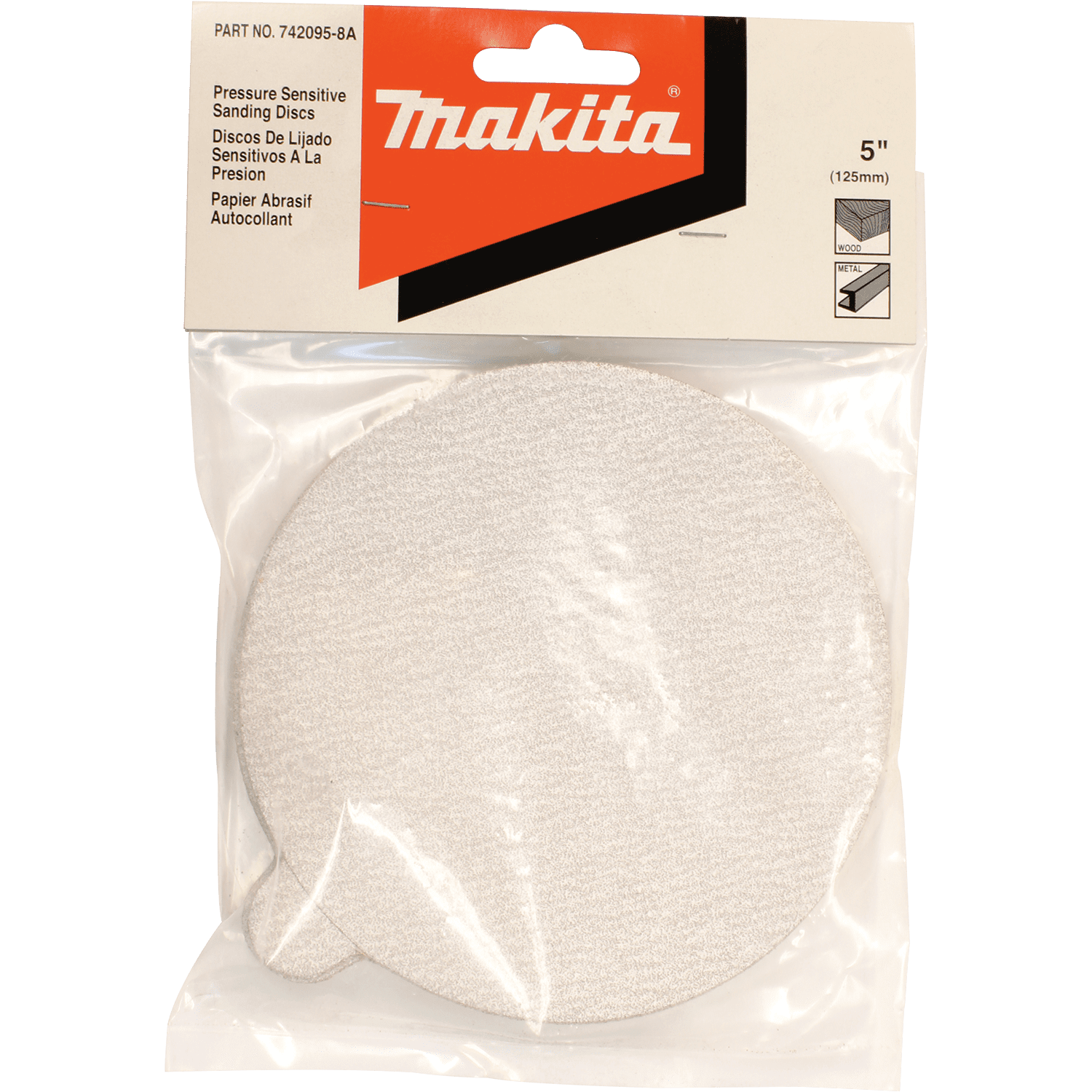 Makita Pressure Sensitive Adhesive (PSA) Abrasive Disc is designed to work with Random Orbit Sanders to sand a variety of wood surfaces. The paper features an adhesive back for quick changes. Each Disc features high quality backing material for added durability and more efficient sanding. High-quality white aluminum oxide grain abrasive for increased durability and sharpness. Open-coat grain distribution and resin glue coating reduces grain clogging and improves finish on wood surfaces. Heavyweight paper provides strong backing and reduces edge tear-out for more sanding. Ideal for use on bare wood, paint, varnish, fillers, plastic and other materials. For use with 5" Random Orbit Sanders equipped with a PSA Backing Pad.