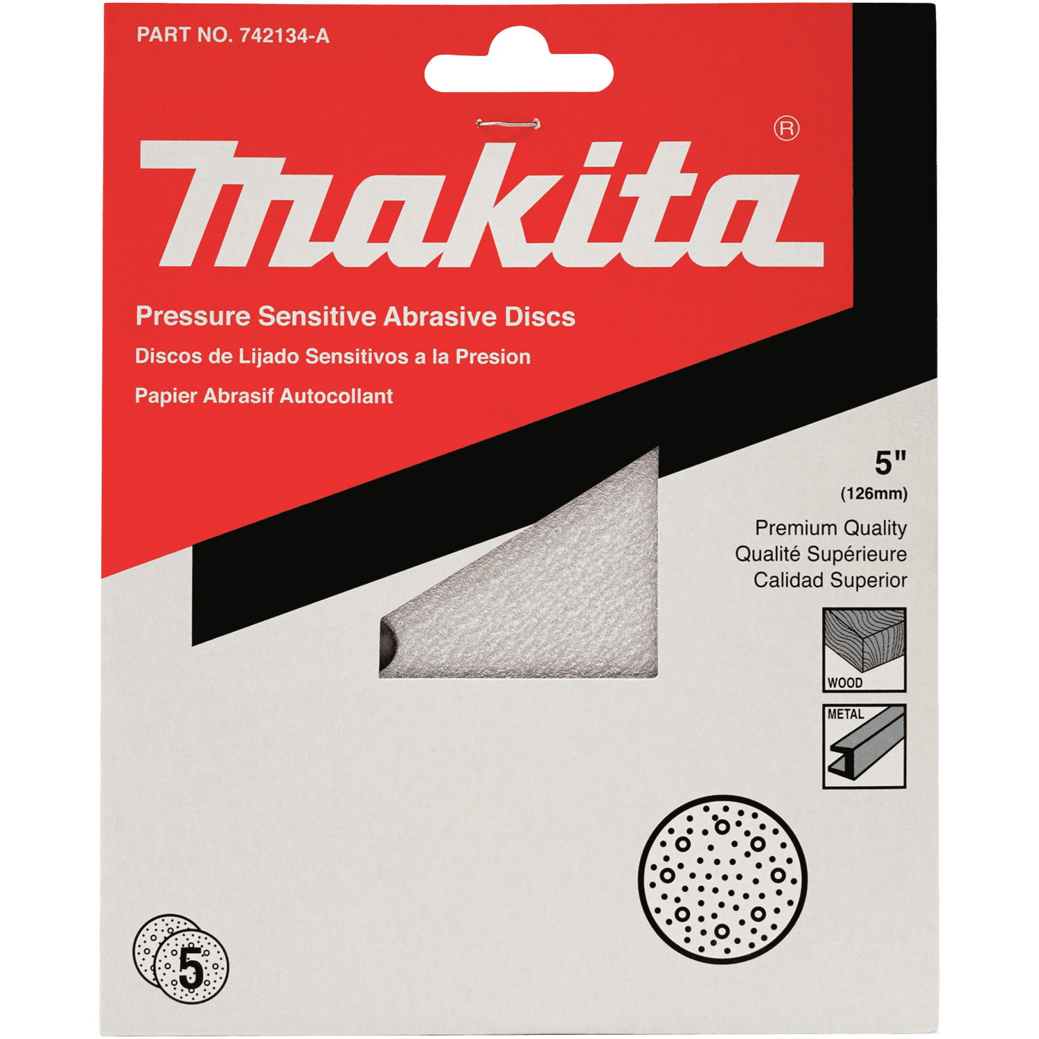 Makita Pressure Sensitive Adhesive (PSA) Abrasive Disc is designed to work with Random Orbit Sanders to sand a variety of wood surfaces. The paper features an adhesive back for quick changes. Each Disc features high quality backing material for added durability and more efficient sanding. High-quality white aluminum oxide grain abrasive for increased durability and sharpness. Open-coat grain distribution and resin glue coating reduces grain clogging and improves finish on wood surfaces. Heavyweight paper provides strong backing and reduces edge tear-out for more sanding. Ideal for use on bare wood, paint, varnish, fillers, plastic and other materials. For use with 5" Random Orbit Sanders equipped with a PSA Backing Pad.