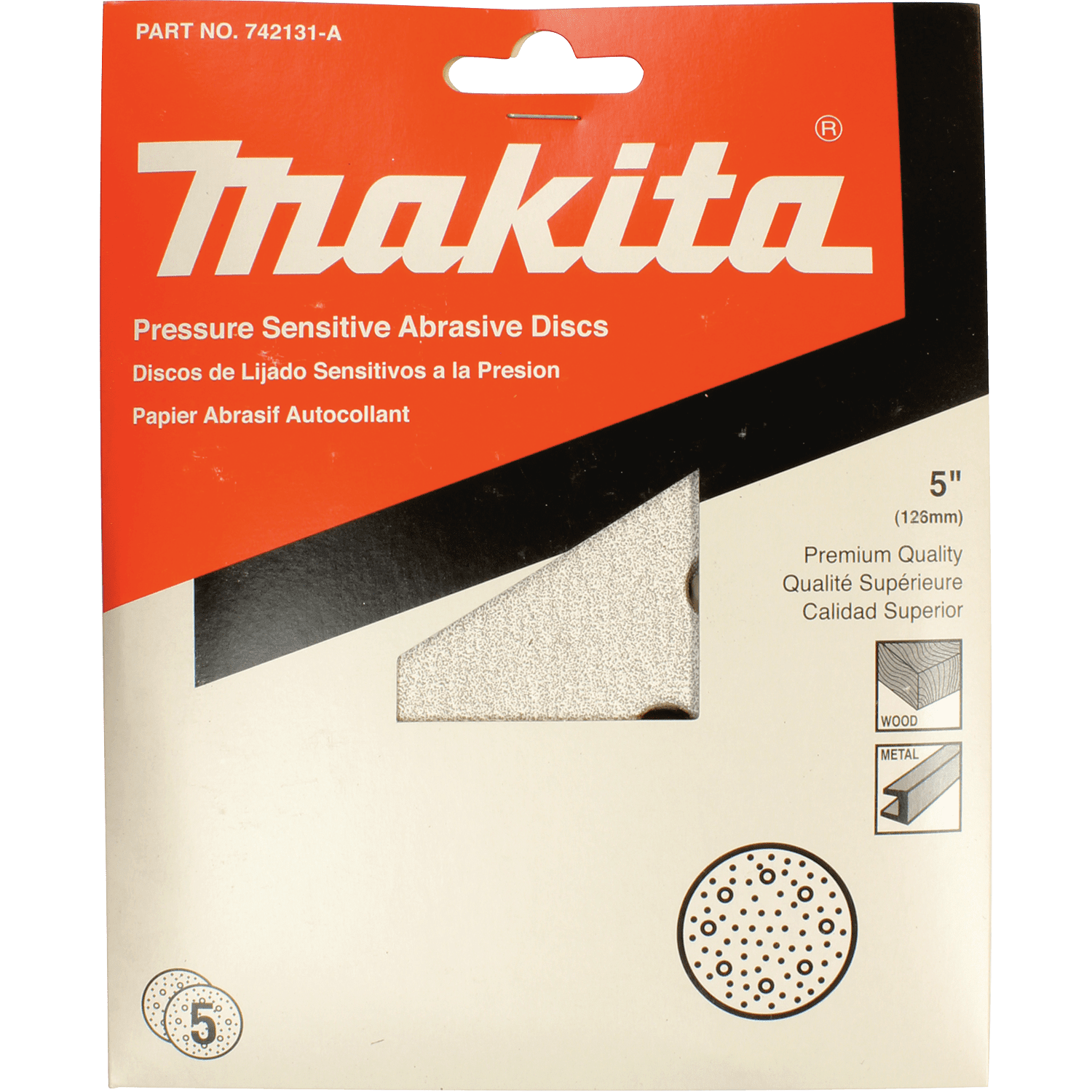 Makita Pressure Sensitive Adhesive (PSA) Abrasive Disc is designed to work with Random Orbit Sanders to sand a variety of wood surfaces. The paper features an adhesive back for quick changes. Each Disc features high quality backing material for added durability and more efficient sanding. High-quality white aluminum oxide grain abrasive for increased durability and sharpness. Open-coat grain distribution and resin glue coating reduces grain clogging and improves finish on wood surfaces. Heavyweight paper provides strong backing and reduces edge tear-out for more sanding. Ideal for use on bare wood, paint, varnish, fillers, plastic and other materials. For use with 5" Random Orbit Sanders equipped with a PSA Backing Pad.