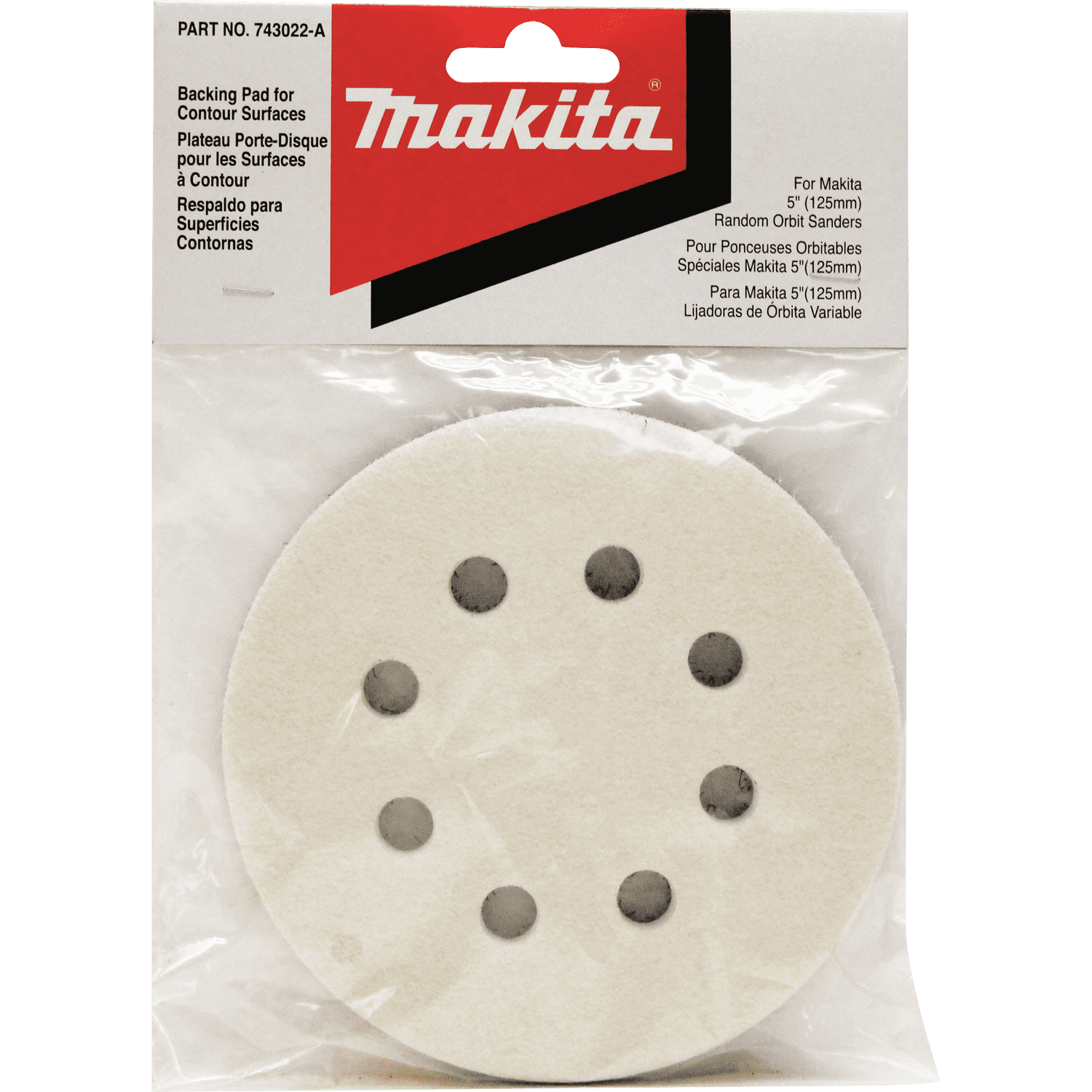 Makita Sanding Pad for sanding contoured surfaces. Made of high quality, durable rubber for long life. Eight holes for efficient for dust extraction. Hook & loop design for quick and easy abrasive paper changes. Hook & loop design for quick abrasive paper changes. Designed for sanding contoured surfaces. Use with 5" eight hole, hook & loop abrasive paper. For use with the Makita 5" Random Orbit Sanders.