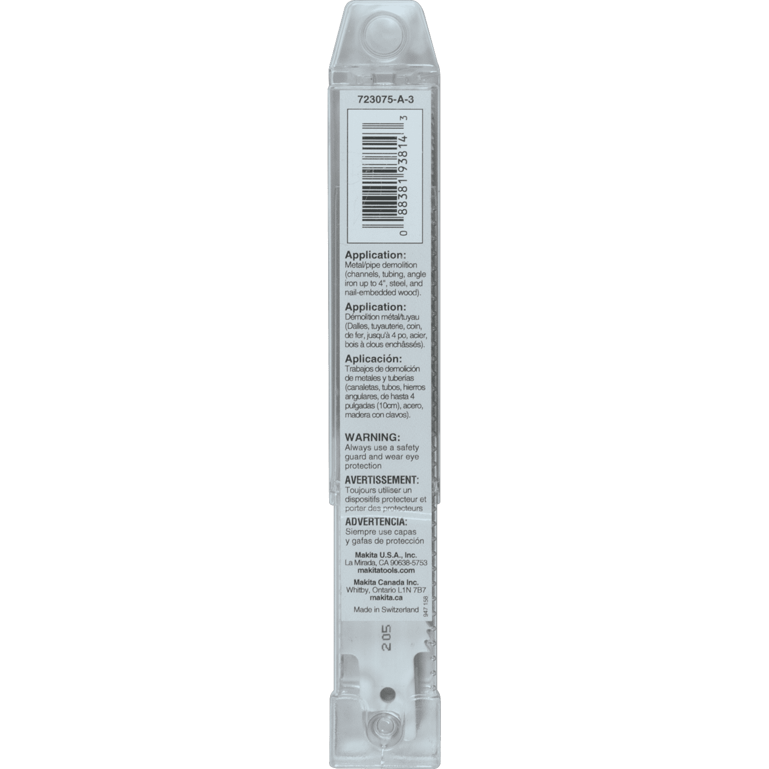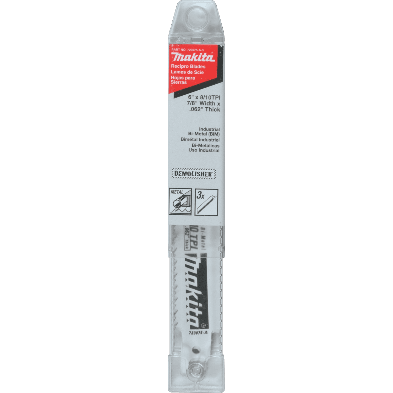 Makita Demolisherâ„¢ reciprocating saw blades are engineered for the most demanding of demolition applications. The fully reinforced teeth and cobalt content minimize teeth breakage and increases durability. Added blade thickness increases its resistance to bending. Cobalt content set to maximize blade durability and wear in high impact demolition applications. Additional 7/8 in. width increases blade life. First tooth consistently centered on each blade for straight plunge cuts. Fully reinforced teeth minimizes teeth breakage. .062 in. thickness increases resistance to bending. Bi-Metal construction lasts 10 times longer than HCS blades. For making demolition cuts without the blade bending in metal, pipe, channel and angle iron.