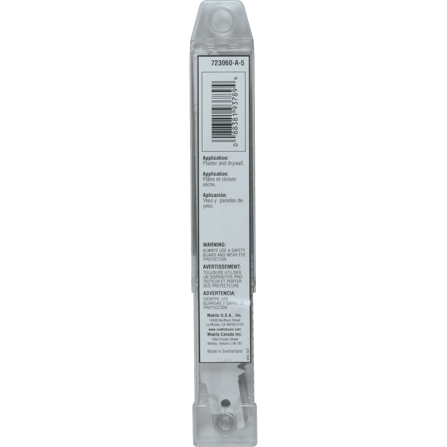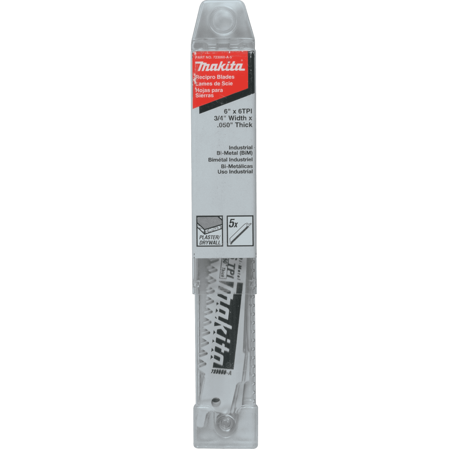 Makiita Drywall and Plaster Cutting Recriprocating Saw Blades are made from high quality steel for clean cuts and longer life. They are designed to make quick cuts in drywall and plaster. The blade features a 3/4 in. width for faster cutting. Bi-Metal construction lasts 10 times longer than HCS blades. First tooth consistently centered on each blade for straight plunge cuts. For making cuts in drywall, plaster and plastic from 5/16" to 4". Convenient 5 pack.