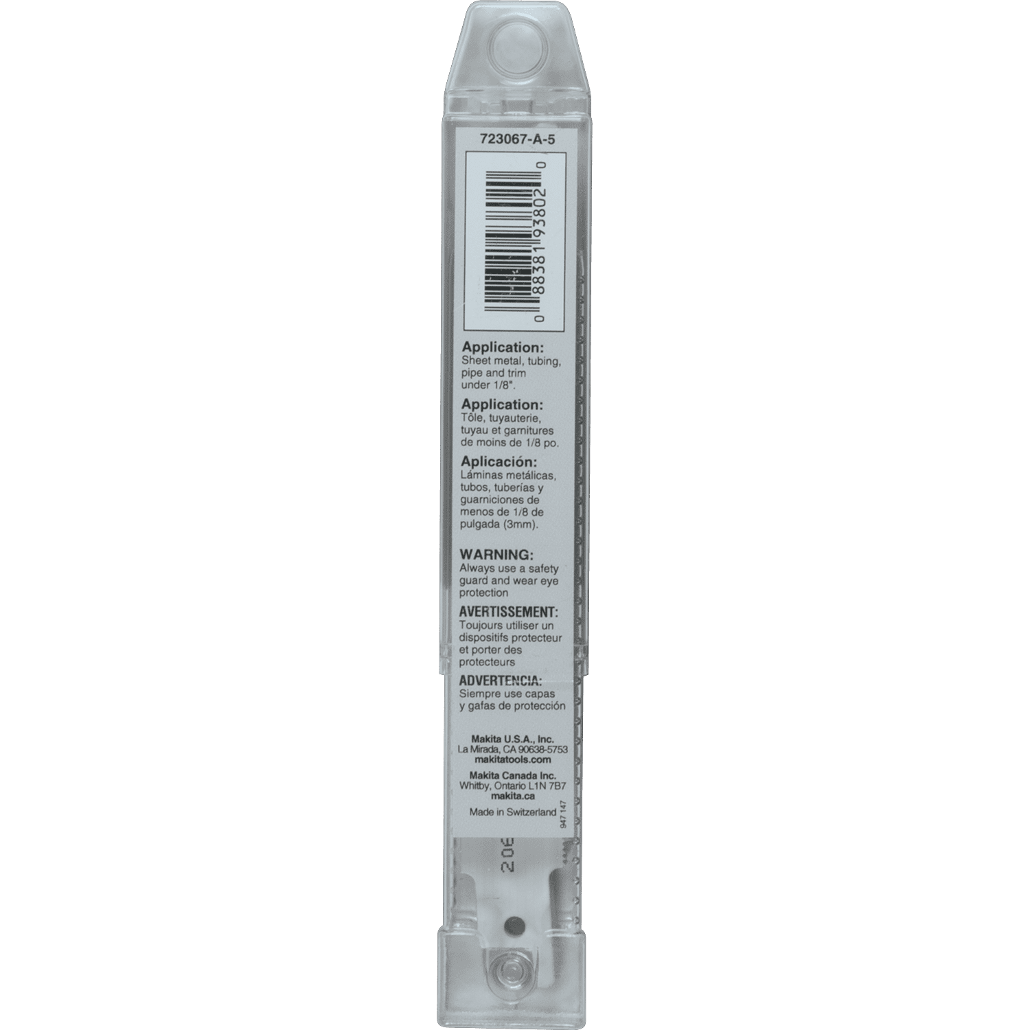 Makita Metal Cutting Reciprocating Saw Blades are made from high quality steel for clean cuts and longer life. They are designed to cut through various types and thickness of metal. The blade features a 3/4" width for faster cutting. Bi-Metal construction lasts 10 times longer than HCS blades. .035" blade thickness for making fast cuts in metal. For making cuts in pipe, conduit, channel and thin Gauge (In.) metal from 18 Gauge (In.) to 1/8". Convenient 5 pack.