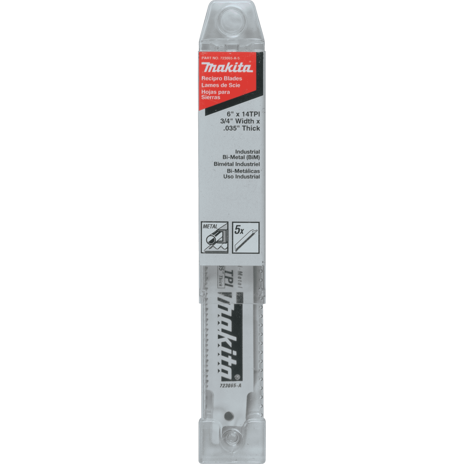 Makita Metal Cutting Reciprocating Saw Blades are made from high quality steel for clean cuts and longer life. They are designed to cut through various types and thickness of metal. The blade features a 3/4" width for faster cutting. Bi-Metal construction lasts 10 times longer than HCS blades. .035" blade thickness for making fast cuts in metal. For making cuts in pipe, conduit, channel and metal from 3/16" to 1/4". Convenient 5 pack.