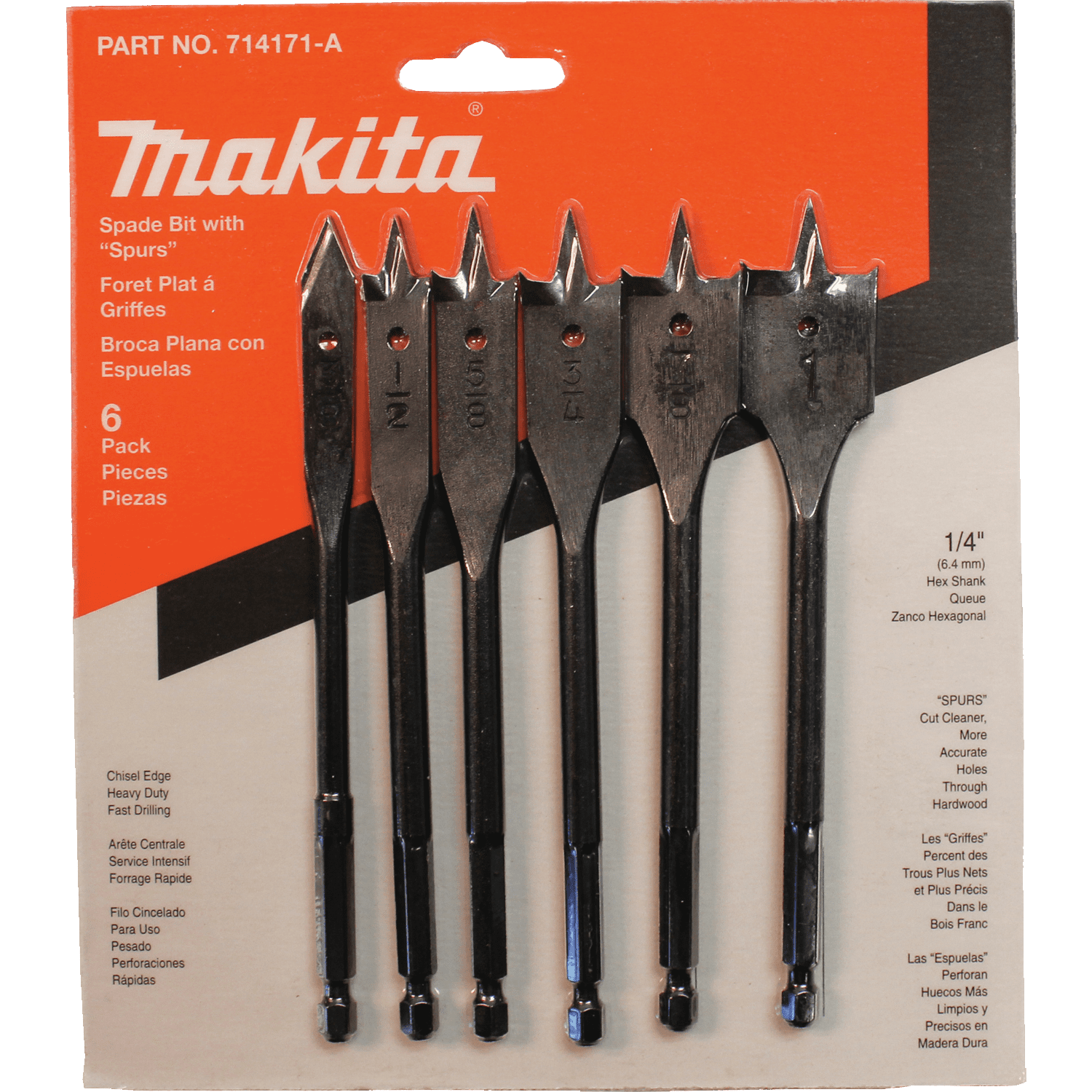 Makita Heavy Duty Spade Bits feature "spurs" that cut cleaner holes in wood. Durable construction allows the Bits to hold up to the heaviest of applications. The versatile 1/4" hex shank allows the Bits to easily be used in both Impact Drivers and Driver-Drills. The aggressive chisel edge means faster, more accurate drilling. Designed with "Spurs" for cleaner cuts and more accurate holes in hardwood. The chisel edge design is more positively angled and digs into the wood. Made from durable, high strength steel for long lasting performance under heavy demands. Ideal for rough boring through wood. Includes: 3/8", 1/2", 5/8", 3/4", 7/8" & 1" Spade Bits. 1/4" hex shank works directly with Impact Drivers and Driver-Drills