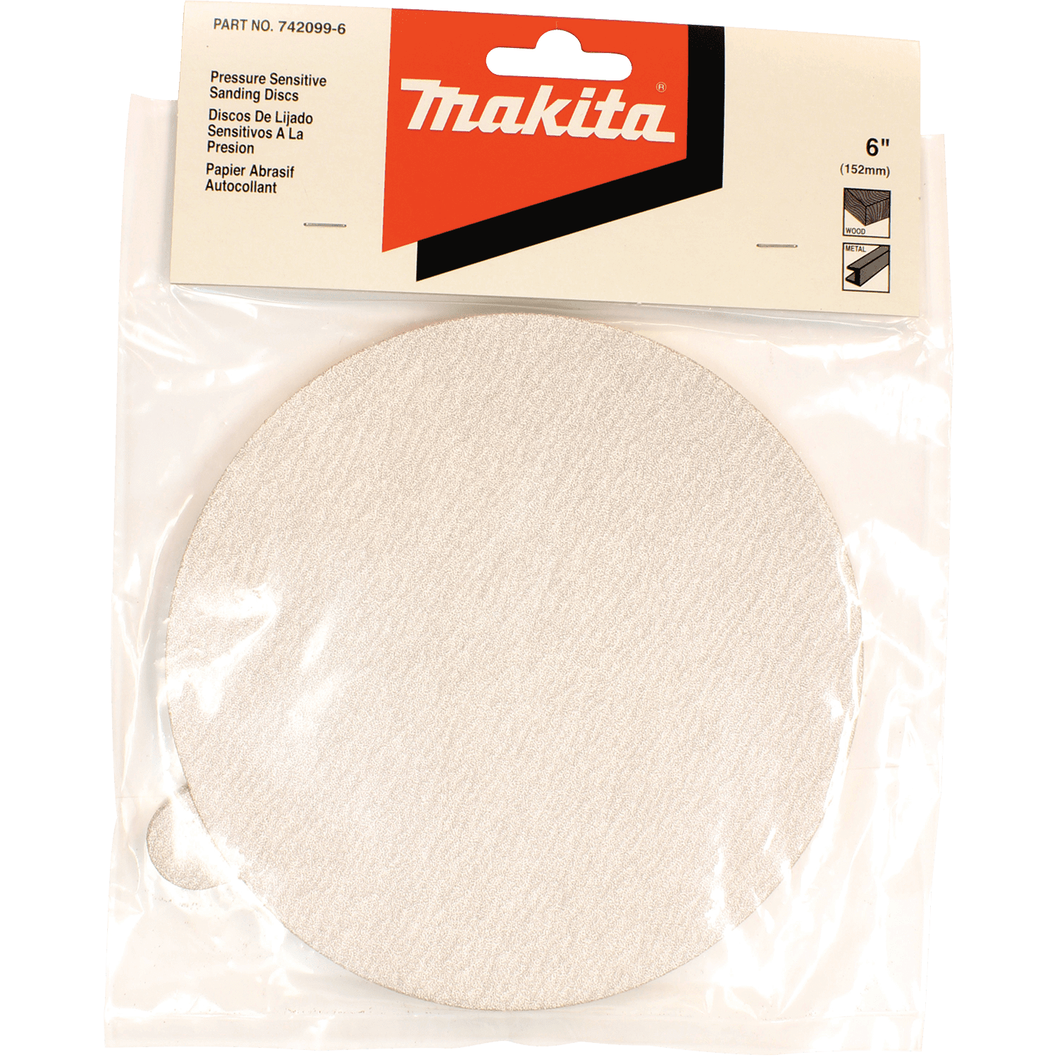 Makita Pressure Sensitive Adhesive (PSA) Abrasive Disc is designed to work with Random Orbit Sanders to sand a variety of wood surfaces. The paper features an adhesive back for quick changes. Each Disc features high quality backing material for added durability and more efficient sanding. High-quality white aluminum oxide grain abrasive for increased durability and sharpness. Open-coat grain distribution and resin glue coating reduces grain clogging and improves finish on wood surfaces. Heavyweight paper provides strong backing and reduces edge tear-out for more sanding. Ideal for use on bare wood, paint, varnish, fillers, plastic and other materials. Use with 6" random orbit sanders equipped with a PSA backing pad.