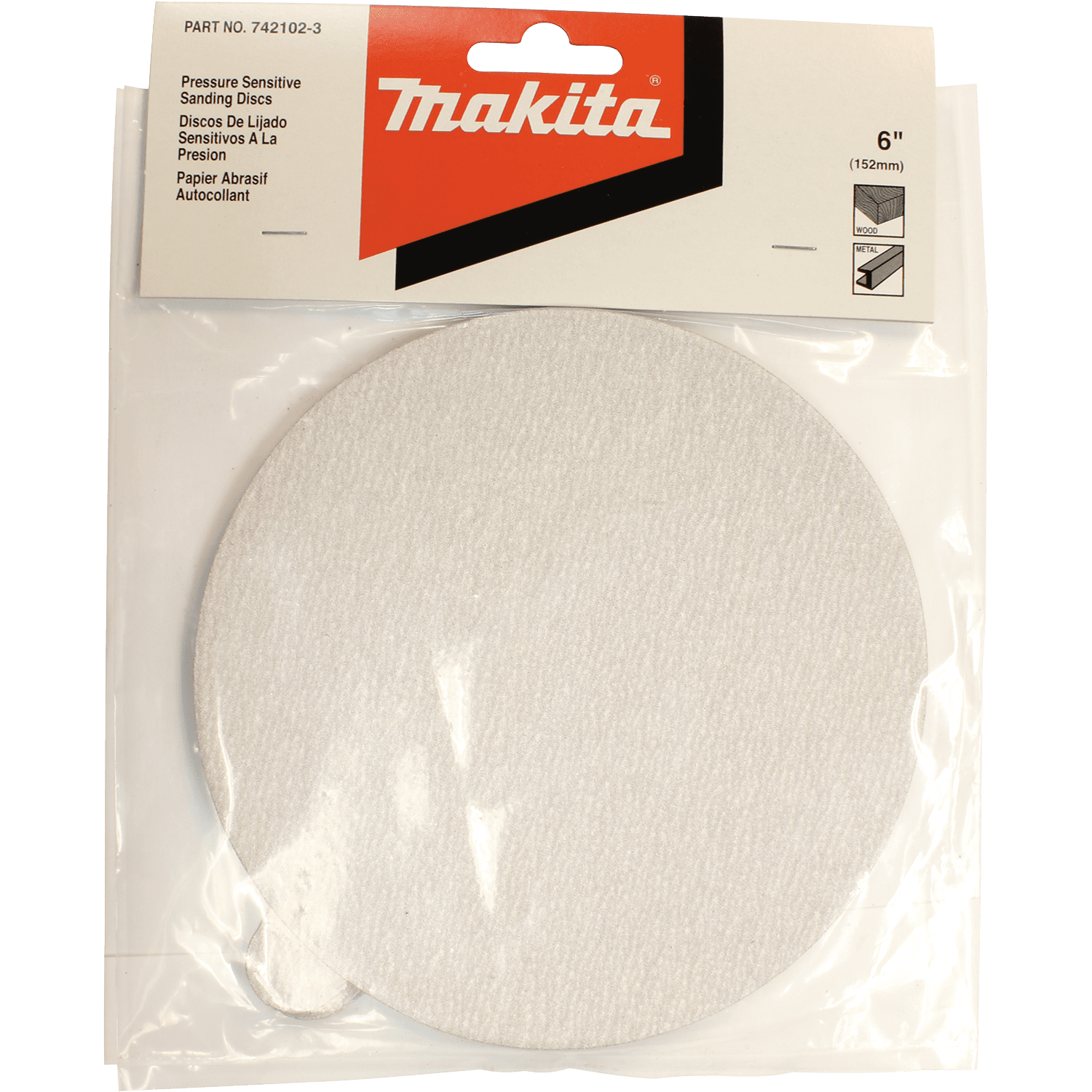 Makita Pressure Sensitive Adhesive (PSA) Abrasive Disc is designed to work with Random Orbit Sanders to sand a variety of wood surfaces. The paper features an adhesive back for quick changes. Each Disc features high quality backing material for added durability and more efficient sanding. High-quality white aluminum oxide grain abrasive for increased durability and sharpness. Open-coat grain distribution and resin glue coating reduces grain clogging and improves finish on wood surfaces. Heavyweight paper provides strong backing and reduces edge tear-out for more sanding. Ideal for use on bare wood, paint, varnish, fillers, plastic and other materials. Use with 6" random orbit sanders equipped with a PSA backing pad.