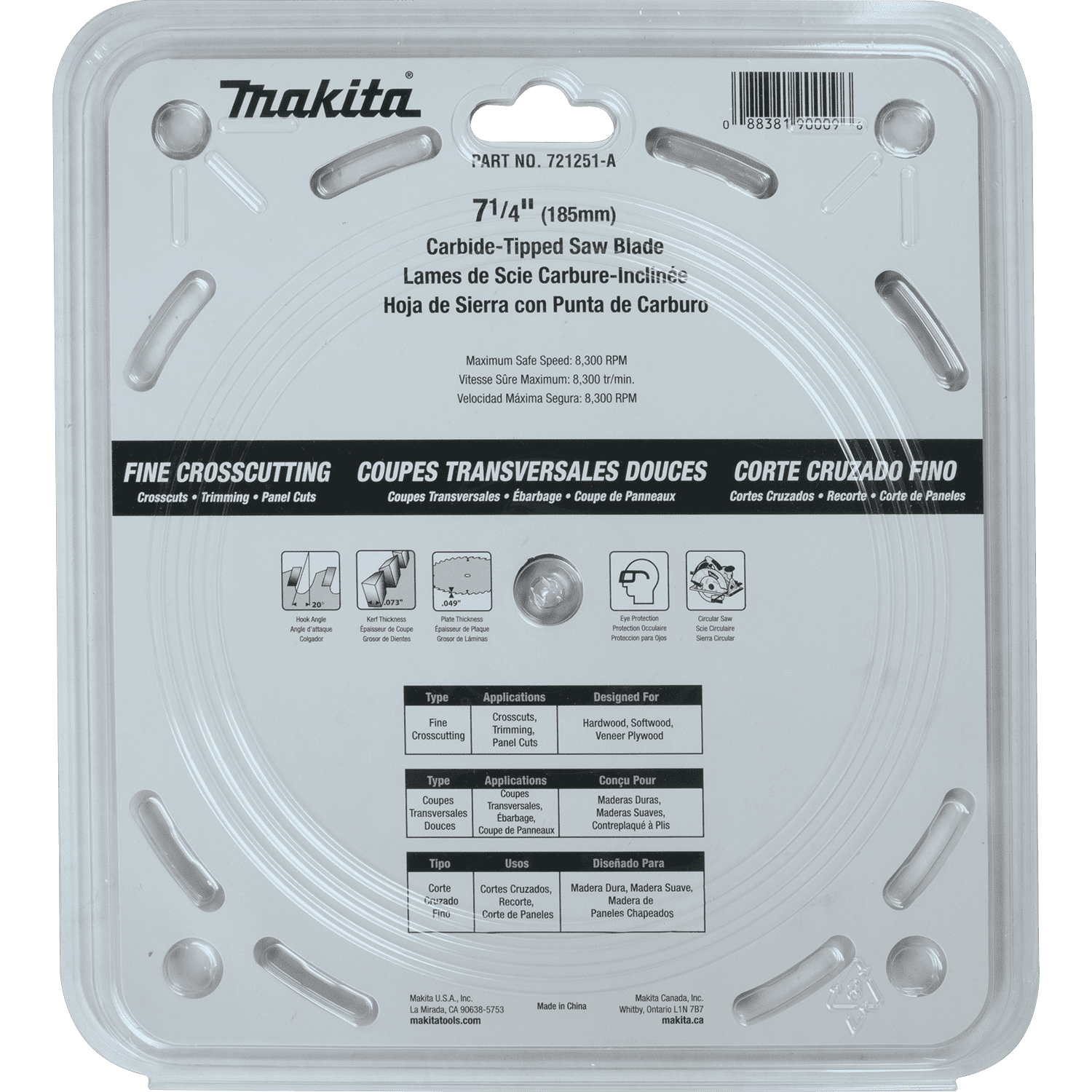 The Makita 7-1/4" 40 Tooth Fine Crosscutting Carbide-Tipped Circular Saw Blade is expertly tensioned for true cuts. The blade is designed for use in fine crosscutting applications. Carbide tooth design for quality cuts and longer life. Fully hardened and expertly hand-tensioned steel saw plates for true cuts. Carbide tooth design for quality cuts and longer life. For use in fine crosscutting applications. For use with 7-1/4" circular saws.
