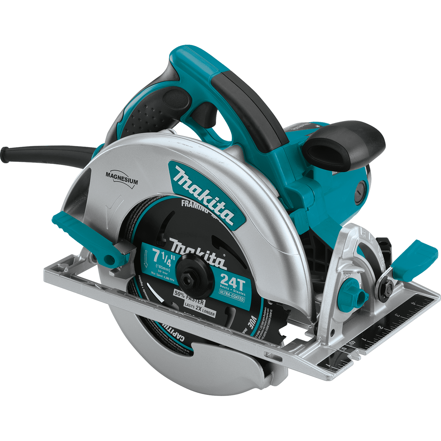 The Makita 5007MG 7-1/4 in. Magnesium Circular Saw features highly durable magnesium components and a powerful 15 AMP Makita-built industrial motor. The 5007MG seamlessly balances weight, power, durability, and ease of use, making it the most refined circular saw on the market. A built-in dust blower clears the line of cut for more accurate and precise cuts. The 5007MG is built for framing walls, floors and roofs using a range of dimensional lumber and dense engineered lumber, including LVL, PSL and I-Joists, headers, and microlams; as well as ripping panels such as plywood, OSB, particle board, and dense structural panels. Other applications include plunge and bevel cutting, as well as masonry and metal cutting. The 5007MG includes a Makita 7-1/4” Premium Ultra-Coated Framing Blade with Advance Tooth Design. The "M" shaped tooth design features a two-pointed tip and two 10 degree bevel face to maximize cutting performance for a faster, cleaner and longer lasting cut. The carbide tips are specifically set to withstand the harshest conditions such as plowing through nail-embedded wood. The blade is also ultra-coated to reduce heat and pitch build-up for faster, smoother cutting, with special Makita heat vents strategically set to dissipate heat and increase performance. Magnesium components create a lightweight saw (10.6 lbs.) that is well balanced and jobsite tough. Powerful 15.0 AMP motor delivers 5,800 RPM for proven performance and job site durability. Large cutting capacity (2-1/2" at 90°) and bevel capacity (0°-56°) with positive stops at 22.5°, 45°, and 56°. Large rubberized levers for quick and easy one-handed adjustments. Ergonomically designed rubberized handle for better fit and added comfort. Two built-in L.E.D. lights illuminate the line of cut for increased accuracy. Easy-to-read settings with oversized numbers and ruler markings. Built-in dust blower clears the line of cut for greater accuracy. Blade wrench is attached to saw for fast and convenient blade changing. Reinforced power cord withstands jobsite abuse and lowers repair costs. Includes a premium 7-1/4" carbide tipped framing blade that cuts 50% faster and lasts 2x longer. Built-in tether notch (tether sold separately).