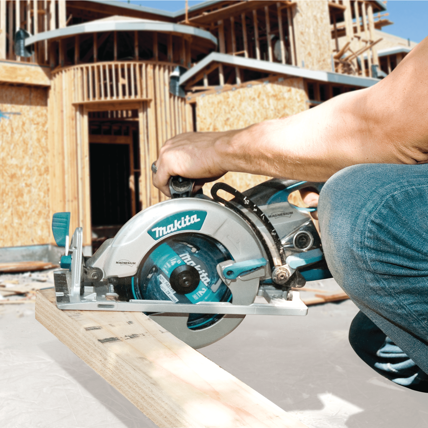 The Makita 7-1/4” Magnesium Hypoid Saw features highly durable magnesium components and a powerful 15 AMP Makita-built industrial motor with a hypoid gearing system for maximum power output. The 5377MG seamlessly balances weight, power, durability, and ease of use for optimum cutting performance. Makita-Built Motor Engineered for Versatile Power The 5377MG features a Makita-built 15 AMP industrial motor that delivers 4,500 RPM, combined with well-balanced magnesium components for a lighter weight saw that delivers true power the professional user demands. Users will benefit from the precision-machined hypoid gears, which deliver more constant power than worm drive gears. Hypoid gears have greater surface contact so more power is transferred over a wider surface, providing increased power and durability. In addition, hypoid gears are in an oil bath for consistent oil coverage. The saw has a large cutting capacity (2-3/8” at 90°) with a maximum bevel capacity of 51.5° and positive stops at 22.5°, 45° and 51.5° for quick back-and-forth changes. Ergonomic and Ease-of-Use Features Magnesium components allowed Makita to engineer a saw with less weight (13.2 lbs.) that is well-balanced and jobsite tough. Additional design details include greater clearance between the rear handle and the blade case to provide a better grip for larger hands or for users with gloves, as well as a wider space between the blade and housing for a clearer view of the blade and measurement scale. Makita also engineered ergonomics and ease-of-use into the saw, including clearly visible depth and bevel markings and ergonomic hand grips to improve overall control while minimizing operator fatigue. The large rubberized levers provide quick, one-handed adjustments for more efficient work. Includes Ultra-Coated Framing Blade The 5377MG includes a Makita 7-1/4” Premium Ultra-Coated Framing Blade with Advance Tooth Design. The "M" shaped tooth design features a two-pointed tip and two 10 degree bevel face to maximize cutting performance for a faster, cleaner and longer lasting cut. The carbide tips are specifically set to withstand the harshest conditions such as plowing through nail-embedded wood. The blade is also ultra-coated to reduce heat and pitch build-up for faster, smoother cutting, with special Makita heat vents strategically set to dissipate heat and increase performance. The 5377MG also include a blade wrench attached to the saw for fast and convenient blade changing. Engineered for a Range of Applications The 5377MG is built for framing walls, floors and roofs using a range of dimensional lumber and dense engineered lumber, including LVL, PSL and I-Joists, headers, and microlams; as well as ripping panels such as plywood, OSB, particle board, and dense structural panels. Other applications include plunge and bevel cutting, as well as masonry and metal cutting. Magnesium components create a lightweight saw (13.2 lbs.) that is well balanced and job site tough. Oil bath technology is created with a built-in fan and sealed gear housing to ensure 100% oil surface coating for less maintenance. Large cutting capacity (2-3/8" at 90°) with positive stops at 22.5°, 45° and 51.5°. High quality, heat treated hypoid steel gears are engineered for less maintenance. Powerful 15 AMP motor delivers 4,500 RPM with compressed winding technology to keep the overall size more compact yet deliver job site durability. Better fit with comfortable rubber grip on handle. Retractable hook allows tool to remain close by, but never in the way. Make quick, one-handed adjustments using large, rubberized levers. Settings are easy to read with oversized number and ruler markings. Blade wrench is attached to saw for fast and convenient blade changing. Reinforced 10 ft. power cord withstands jobsite abuse and lowers repair costs. Includes a premium 7-1/4" carbide tipped framing blade that cuts 50% faster and lasts 2x longer.
