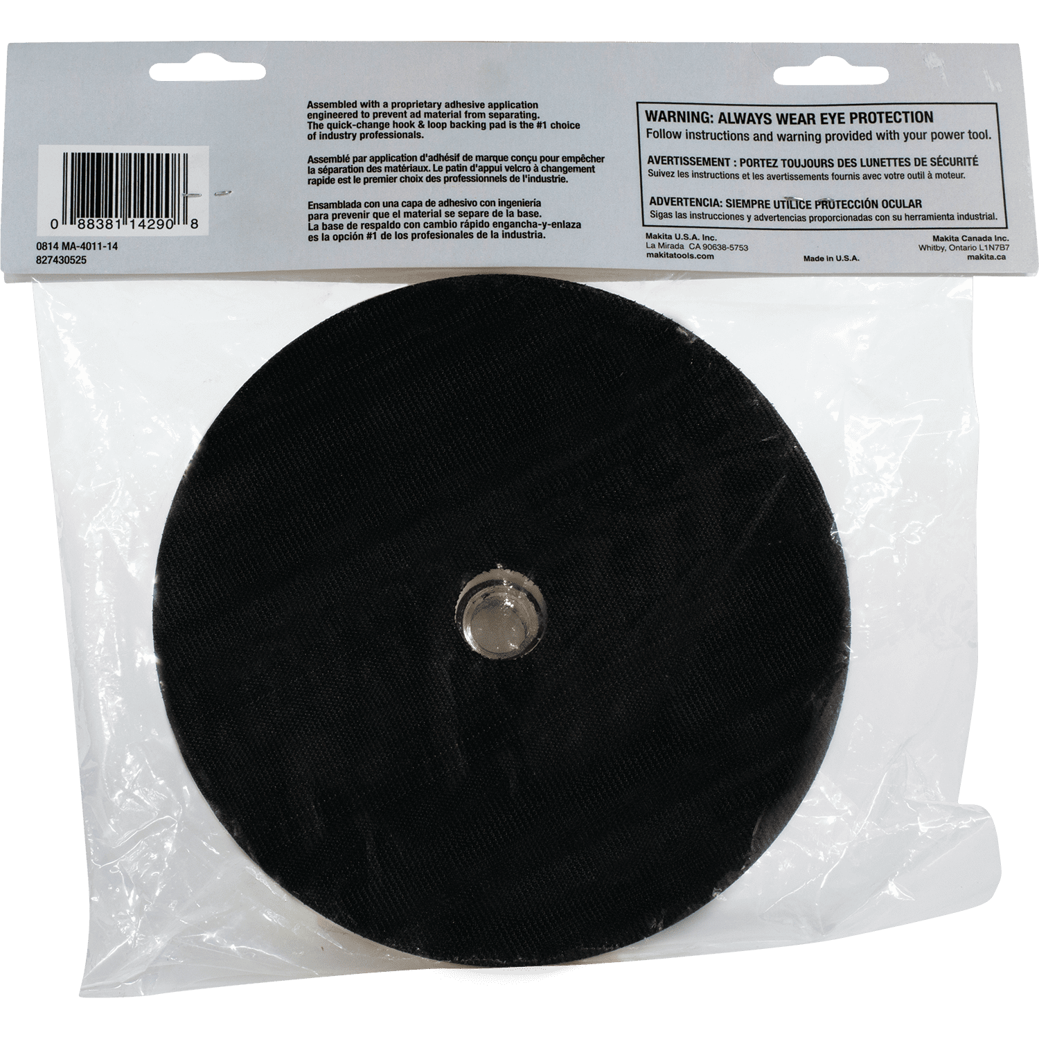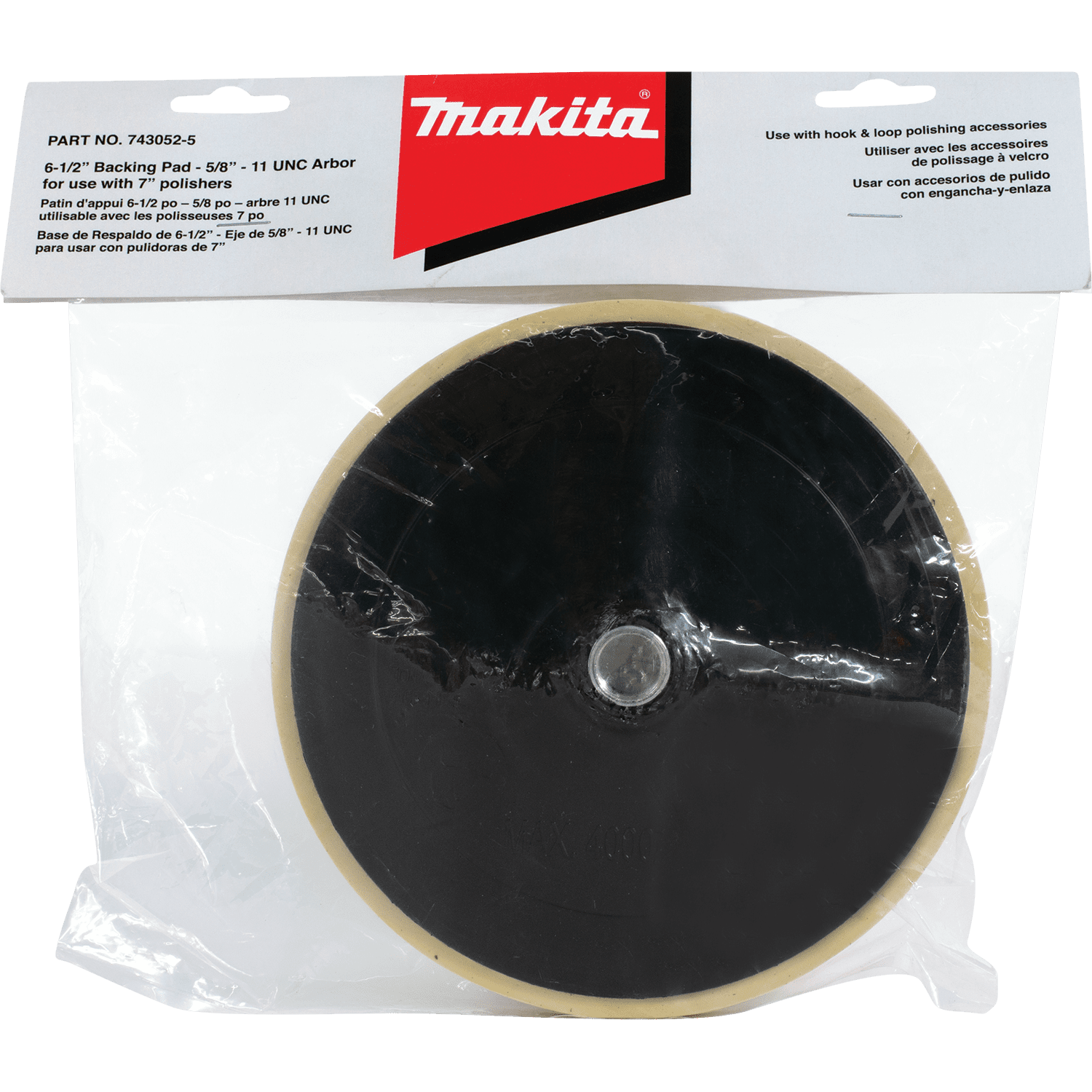 The Makita Hook & Loop Backing Pad can be used on 7" Sander and Polishers that have a 5/8'-11 UNC arbor. It is designed for quick and easy pad changes. The Backing Pad can be used with different types of polishing and compounding pads that use the hook and loop backing pad system. 4,000 maximum RPM Hook and loop design for quick accessory changes. 5/8-11 UNC spindle for fast installation and removal. 4,000 max RPM. Durable construction for long life. For use with hook & loop polishing accessories designed for 7" sanders and polishers. For use with Makita 7" Sanders and Polishers