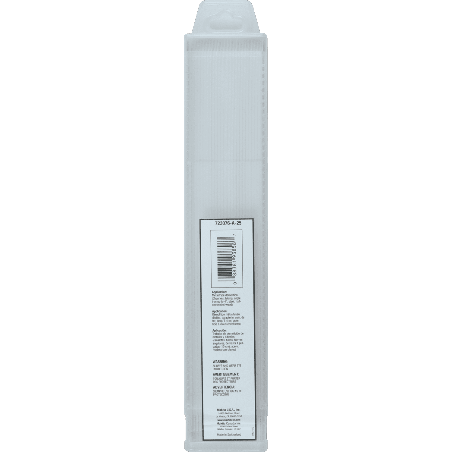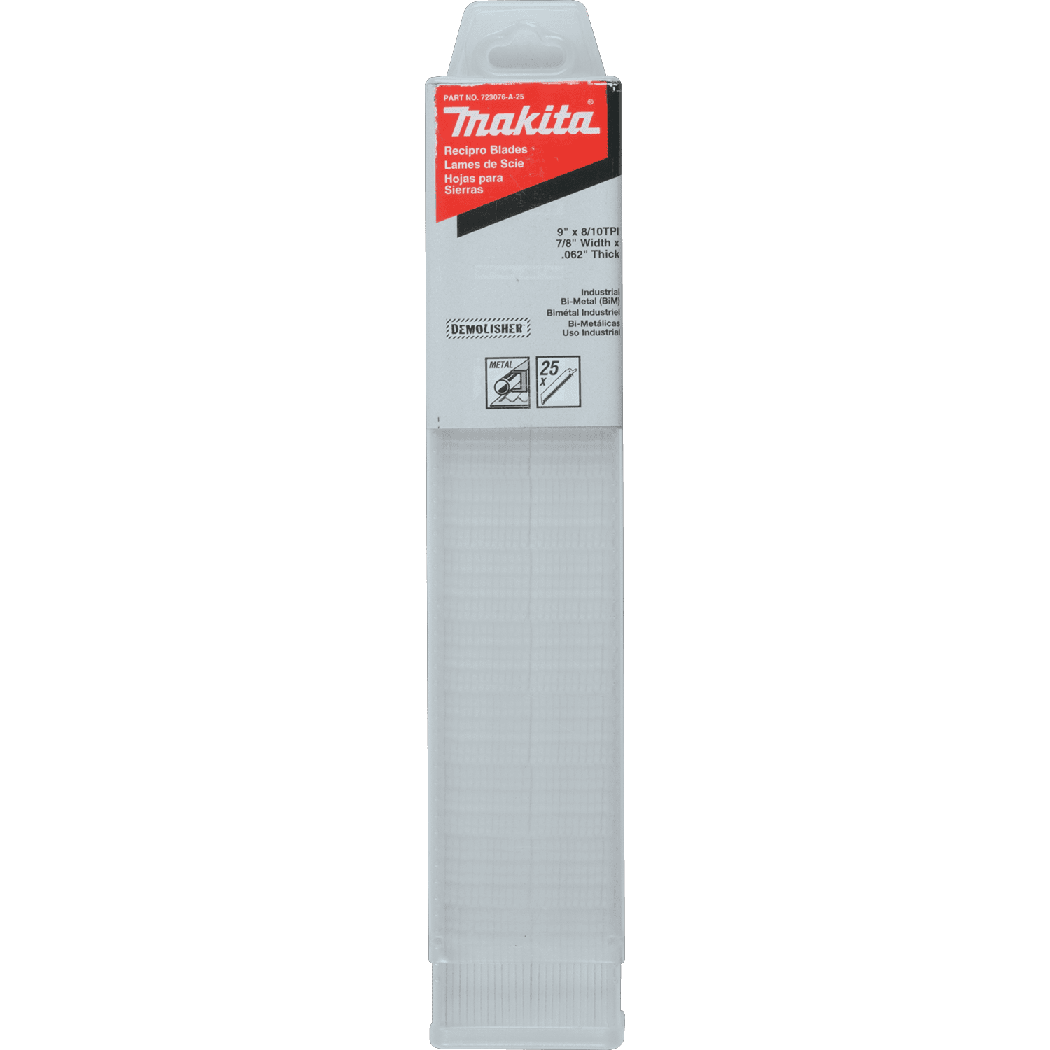 Makita Demolisherâ„¢ reciprocating saw blades are engineered for the most demanding of demolition applications. The fully reinforced teeth and cobalt content minimize teeth breakage and increases durability. Added blade thickness increases its resistance to bending. Cobalt content set to maximize blade durability and wear in high impact demolition applications. Additional 7/8 in. width increases blade life. First tooth consistently centered on each blade for straight plunge cuts. Fully reinforced teeth minimizes teeth breakage. .062 in. thickness increases resistance to bending. Bi-Metal construction lasts 10 times longer than HCS blades. For making demolition cuts without the blade bending in metal, pipe, channel and angle iron.