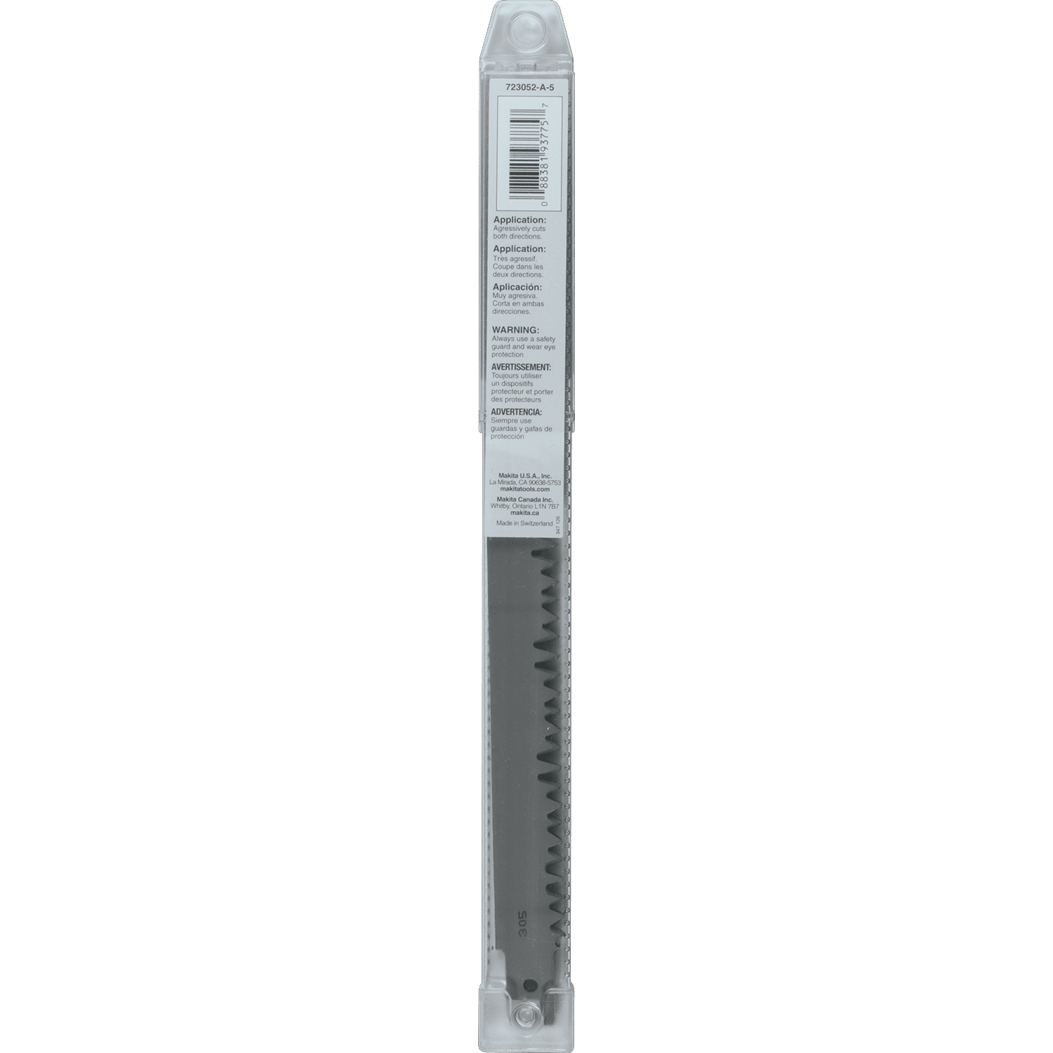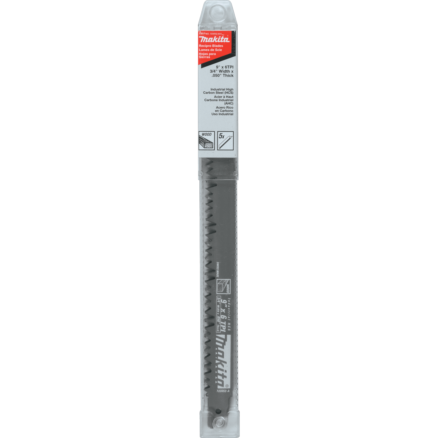 Makita Wood Cutting Reciprocating Saw Blades are made from high quality steel for clean cuts and longer life. They are designed to cut through a variety of wood building materials. The blades feature a 3/4 in. width for faster cutting. High carbon steel (HCS) construction for fast and efficient cutting. First tooth consistently centered on each blade for straight plunge cuts. For fast, aggressive cuts in green wood, pruning tree branches and firewood 5/8" to 6". Convenient 5 pack.
