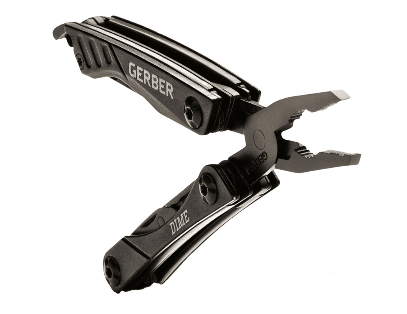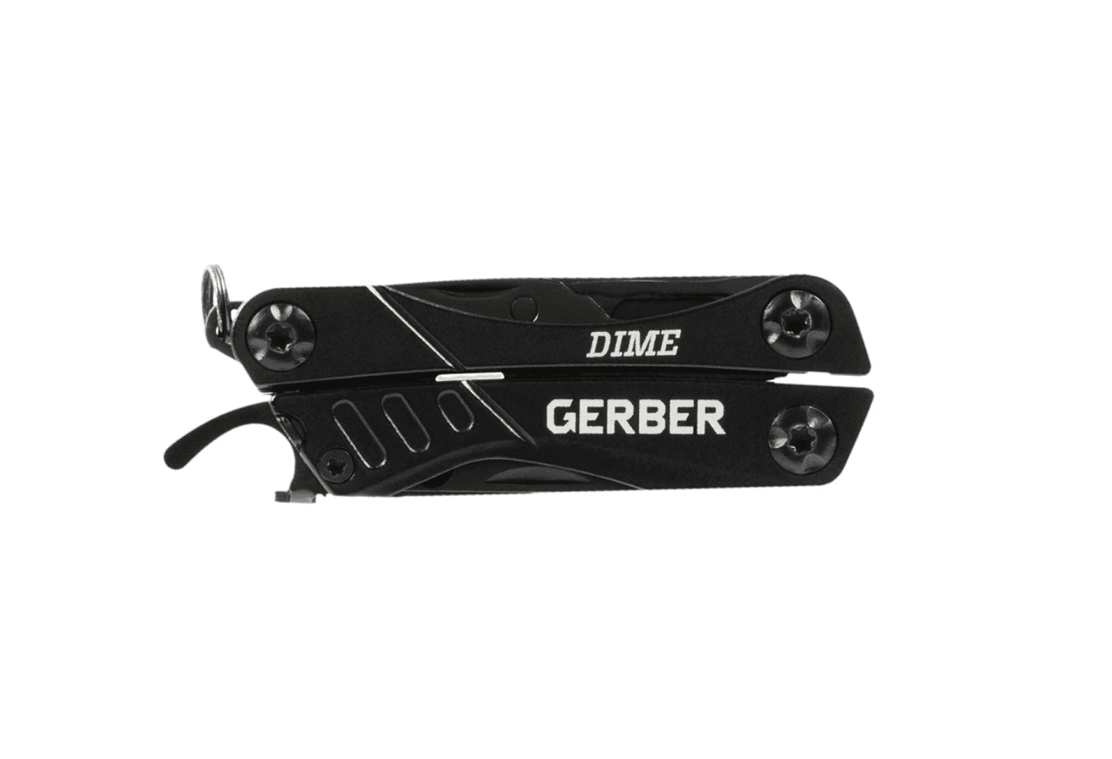 - DescriptionDime Black Butterfly Opening Multi Tool Overall Length: 4.25" Closed Length: 2.75" Weight: 2.2 oz. Compact, lightweight size fits perfectly in pocket Convenient, easily accessible butterfly opening Sturdy stainless steel construction
