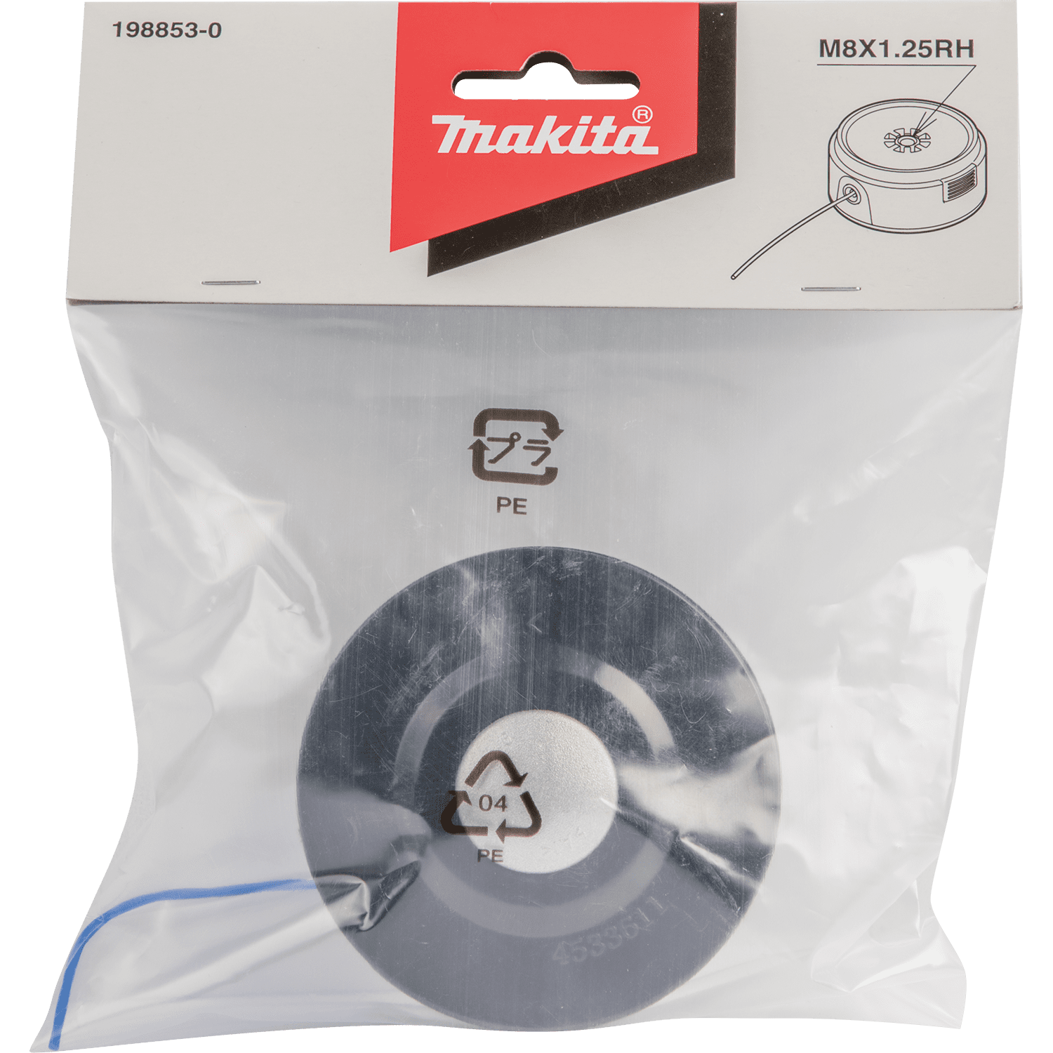 Makita Bump & Feed Trimmer Head allows the operator to adjust line without stopping the trimmer. For use with Makita Cordless String Trimmer model RU03Z. M8 X 1.25 RH arbor. Accepts up to 26’ of .065". Trimmer head comes equipped with .065" standard round trimmer line. Bump and feed for quick line advancement. Metal reinforced bump knob to extend life. Compact trimmer head with single nylon cord cutting. For use with Makita model RU03.