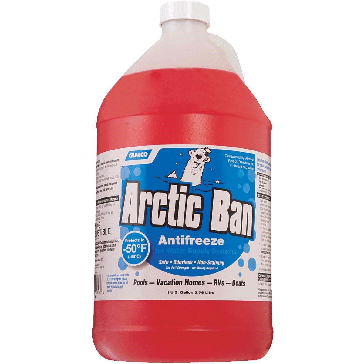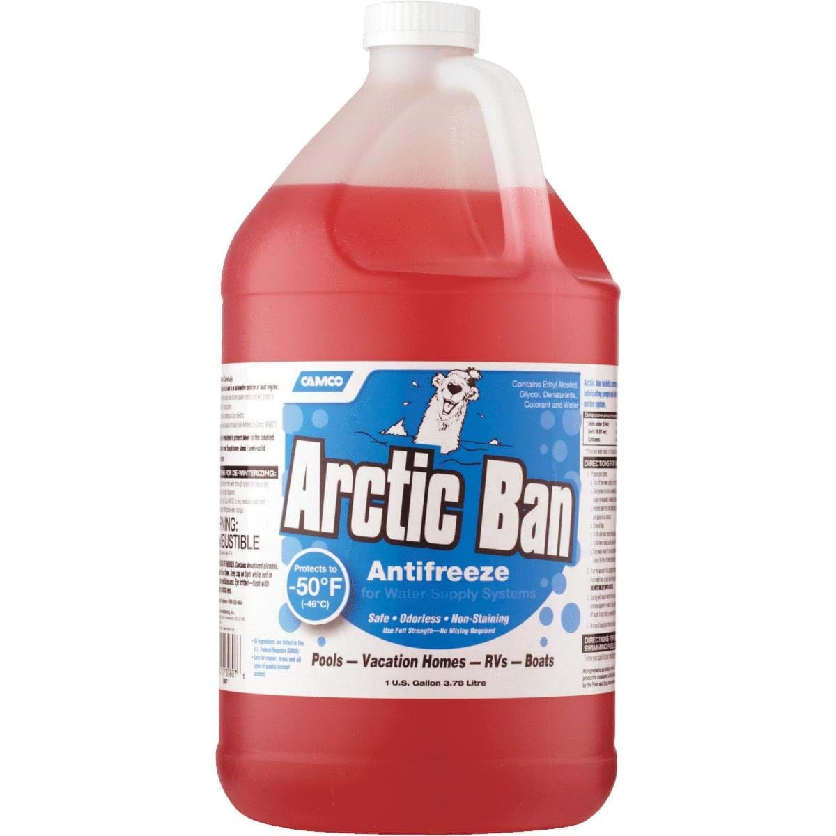 Arctic Ban is ethyl alcohol based and blended with propylene glycol. Protects recreational vehicles, summer cottages, and swimming pools from water system freeze up to -50 deg. burst. Nontoxic and tasteless. Safe for fresh water systems. Inhibit fouling and corrosion while preventing algae growth. Helps lubricate pumps and valves throughout the system. No mixing required.