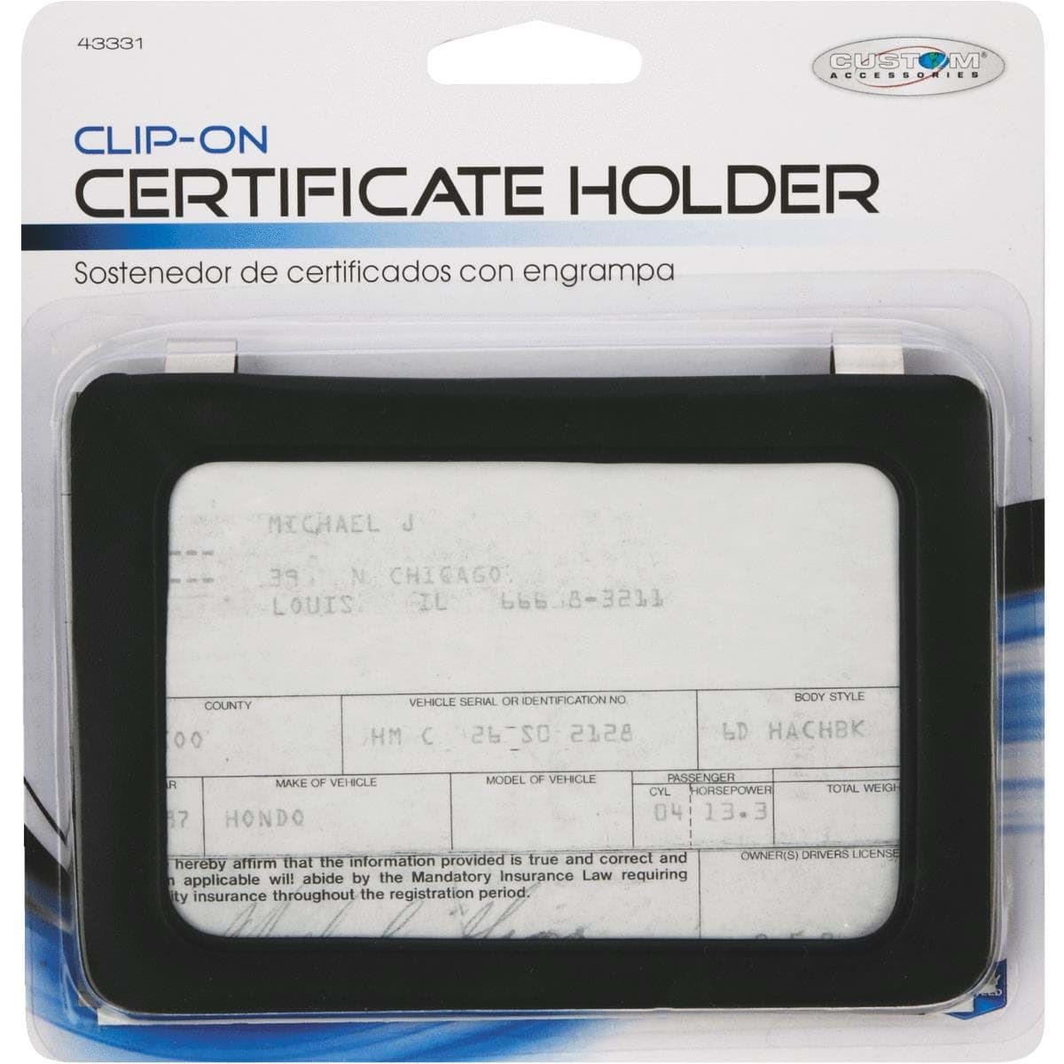 Deluxe clip-on style. Durable plastic frame with window. Holds certificates/registration. Clips to visor. Carded.