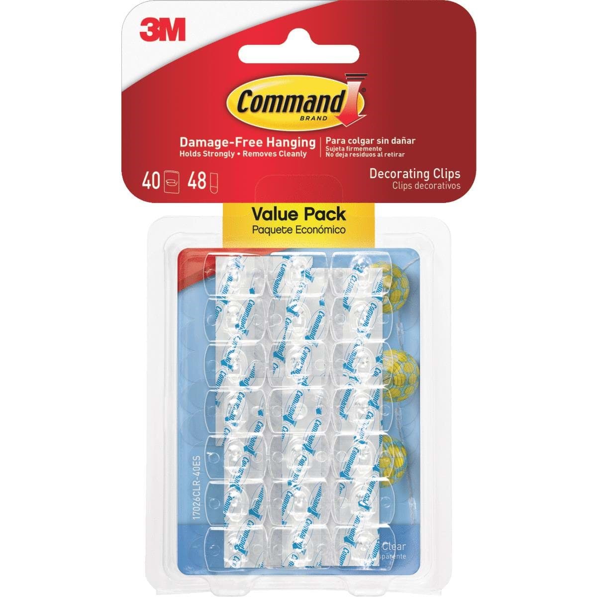 Command clear decor clips can be used to hang holiday lights and other lightweight decorations. Holds strongly to a variety of surfaces including paint, wood, tile, and more. Comes off cleanly leaving no holes, marks, sticky residue, or stains. 40 hooks and 48 strips.