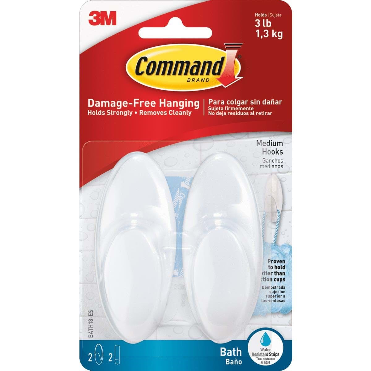Command medium bath hook allows you to keep your bathroom organized both inside and outside of the shower. The hook stands up to hot, wet and humid environments and sticks to a variety of surfaces, including glass, mirror, tile, fiberglass, wood and painted surfaces. Tested and proven to hold better than suction cups, it is easy to apply and come off cleanly without damage. Repositioning is easy with assorted water resistant refill strips. Great for bathroom organization including guest and kids' bathrooms, renters and dorm life. Contains 2 hooks and 2 strips.